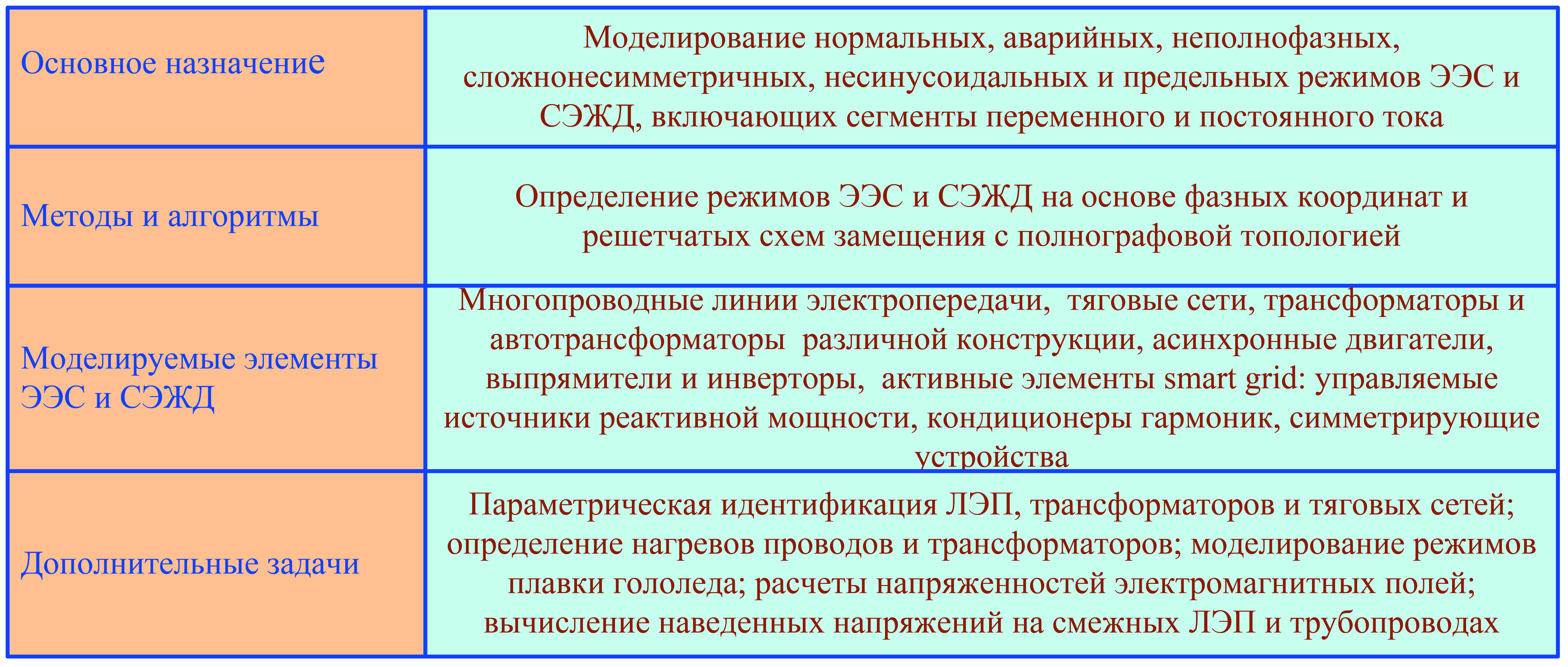 Анализ перечисленных публикаций показывает, что в них рассмотрены важные аспекты ОЗЗ, однако вопросы моделирования таких режимов в технологических ЛЭП железнодорожного транспорта, находящихся в зонах значительного электромагнитного влияния тяговых сетей, изучены недостаточно [33], поэтому возникает необходимость дополнительных исследований, которые на современном этапе должны проводиться на основе цифровых технологий. Для их реализации можно эффективно использовать методы, обеспечивающие адекватное моделирование режимов систем электроснабжения железных дорог (СЭЖД) на основе фазных координат, реализованные в программном комплексе (ПК) Fazonord AC-DC [34, 35], характеристики которого приведены на рис. 1.