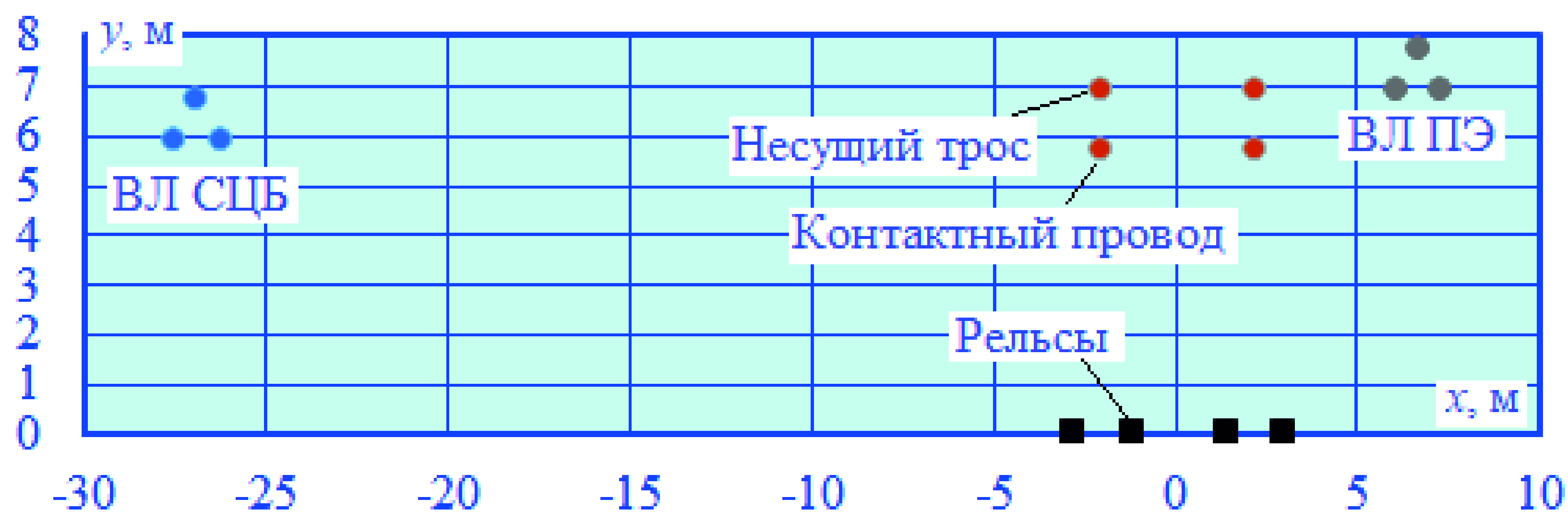 В модели представлены следующие элементы сети: питающие ЛЭП 110 кВ; трансформаторы ТДТНЖ-40000-110/27,5; участок тяговой сети (ТС) протяженностью 50 км с двумя контактными подвесками, четыре рельсовые нити и линия продольного электроснабжения (ВЛ ПЭ) 10 кВ, смонтированная на опорах ТС с полевой стороны. Поперечное сечение системы токоведущих частей показано на рис. 3. Тяговые нагрузки создавались движением двух поездов массой 3192 т в нечетном направлении и составов такого же числа весом 4192 т – в четном.