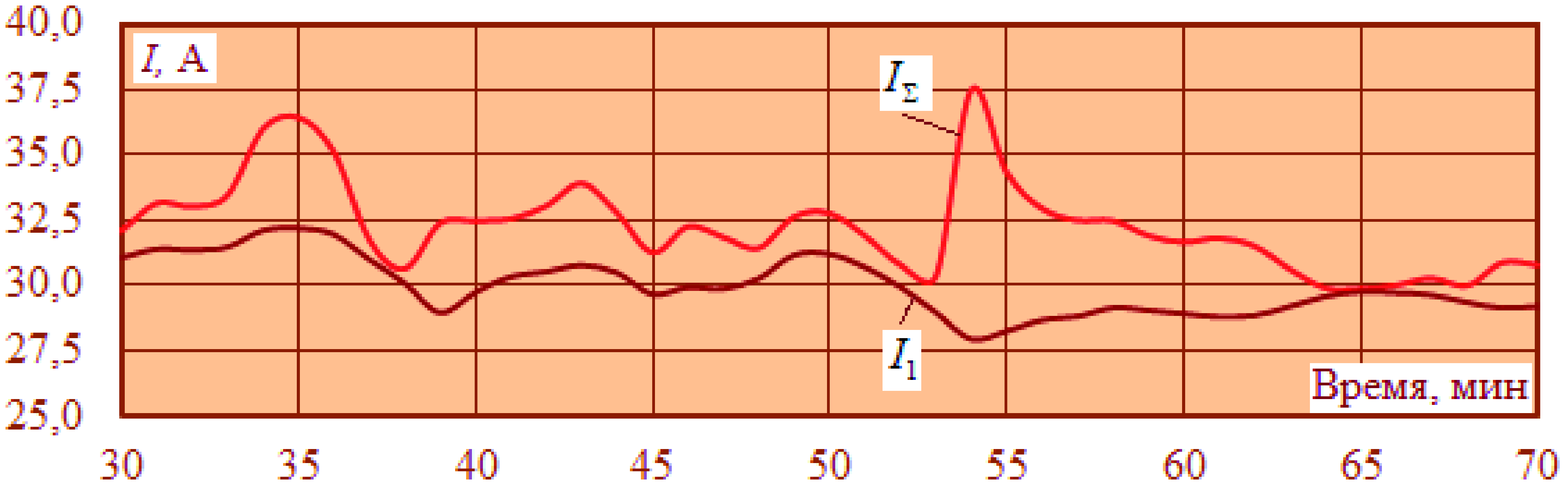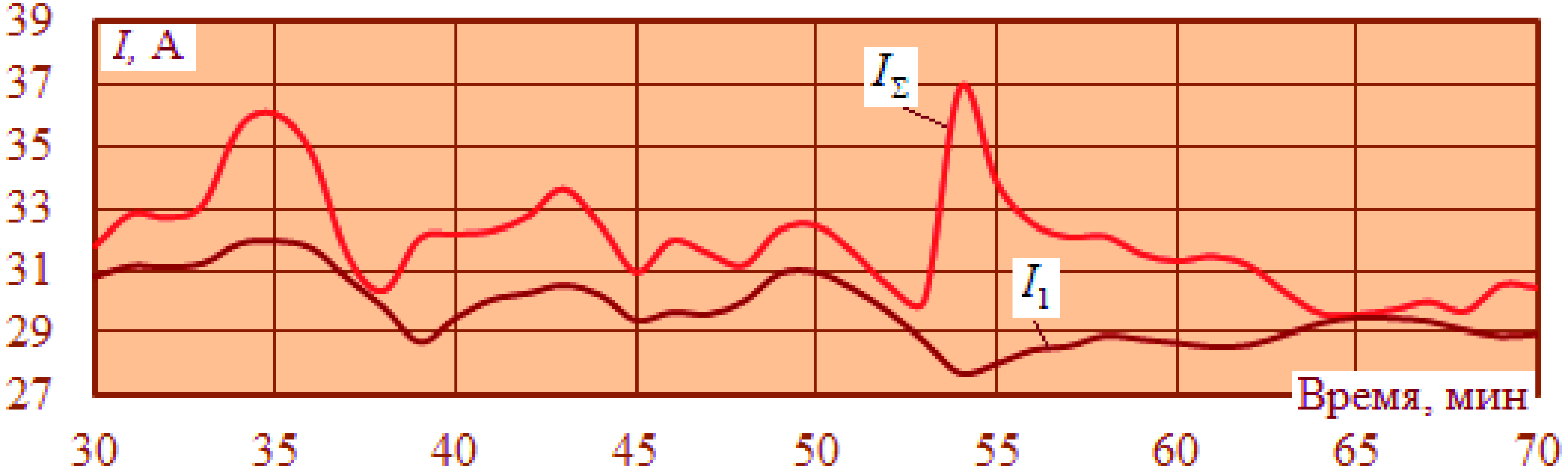 Возникала существенная несимметрия напряжений UΣ фаз линии относительно земли (рис. 4а), которая приводила к различию токов IΣ при ОЗЗ разных фаз. Электровозы вызывали значительную несинусоидальность в ТС. За счет этого имели место заметные гармонические искажения UΣ ВЛ СЦБ: максимум коэффициента kU по фазе А достигал 92 %, а по фазам В и С – 45 и 77 % соответственно. На рис. 5 представлены результаты моделирования режимов ОЗЗ фазы А в точке, находящейся на расстоянии 10 км от подстанции ТП1. Напряжения неповрежденных фаз увеличивались до линейных значений. Потенциал фазы В в точке ОЗЗ снижался до нуля. Максимальные величины коэффициентов kU фаз А и C уменьшались до 41 % и 49 % соответственно. На рис. 6 показан характер изменения токов ОЗЗ. На рис. 7 представлены формы кривых UΣ и IΣ при ОЗЗ.