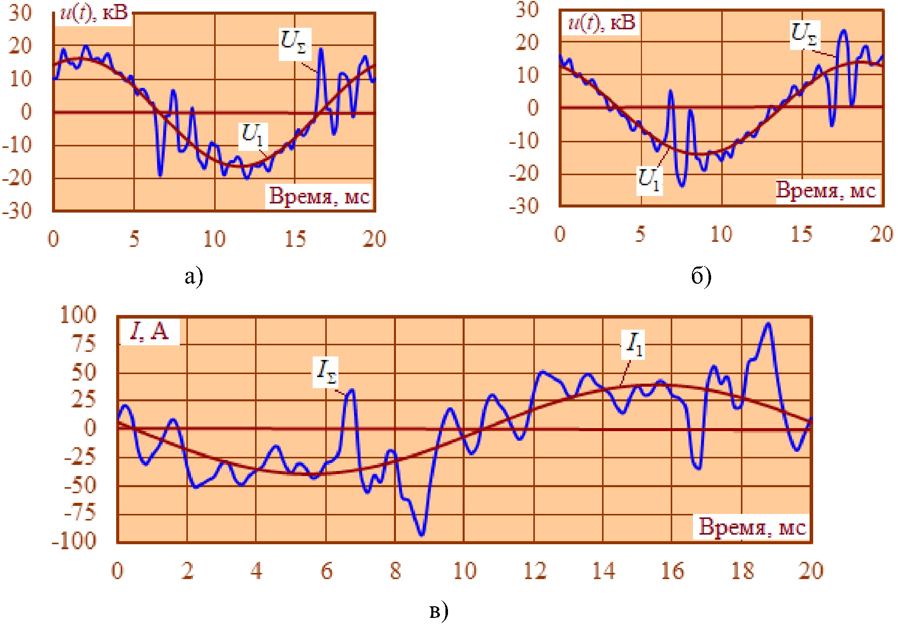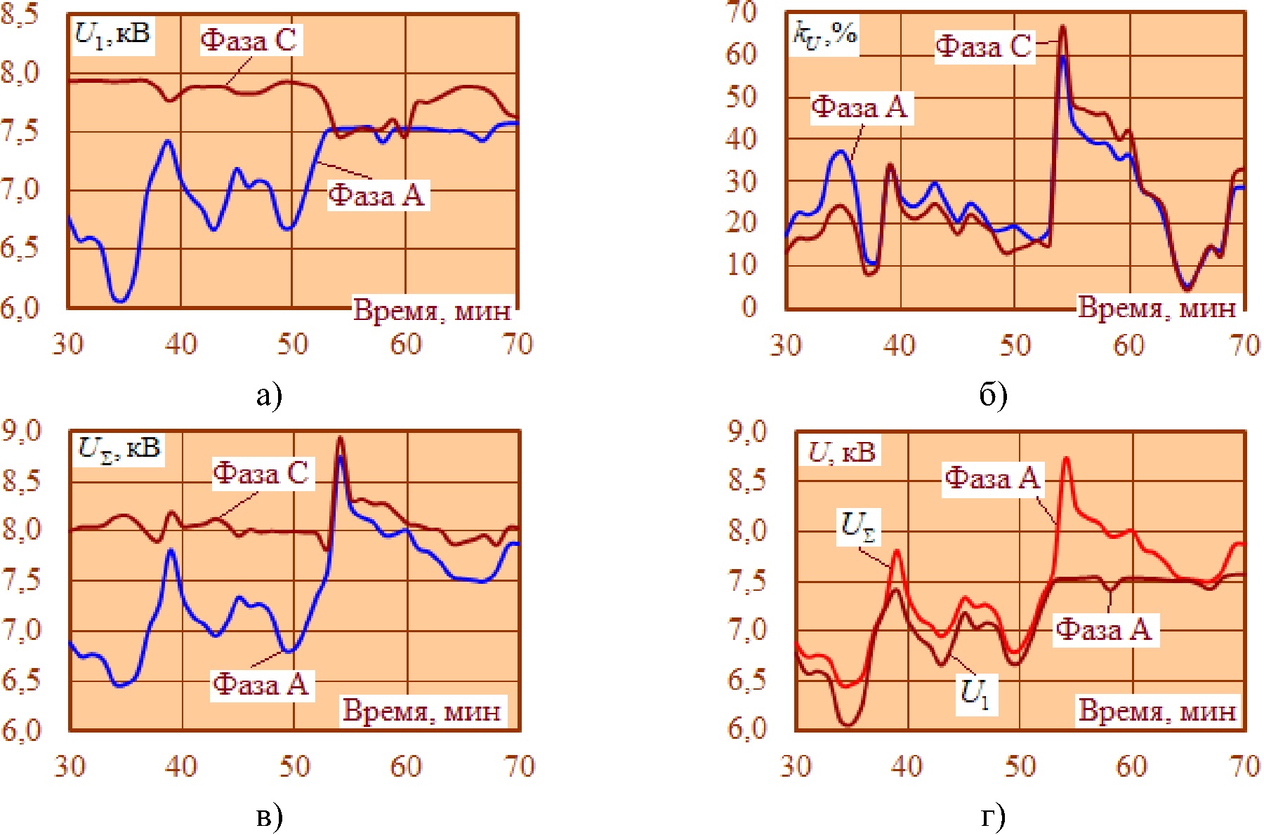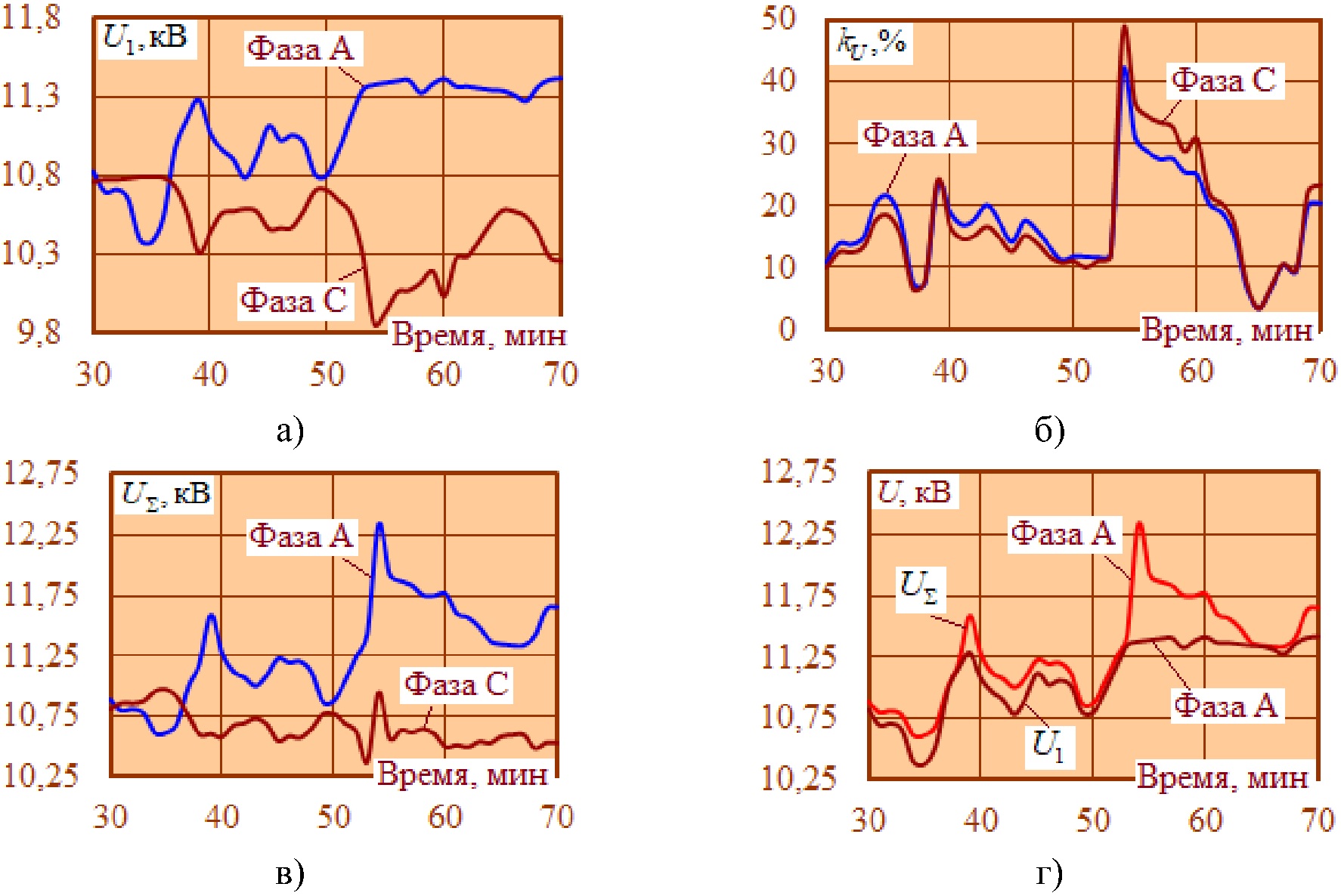 Результаты моделирования проиллюстрированы на рис. 4–8. Исходный, доаварийный режим представлен на рис. 4, на котором приведены графики зависимостей от времени t следующих параметров: напряжений основной частоты U1 = U1 (t), суммарных коэффициентов высших гармоник (ВГ) kU = kU (t), эффективных величин с учетом ВГ UΣ = UΣ (t). На рис. 4г показаны графики, иллюстрирующие сравнение U1 = U1 (t) и UΣ = UΣ (t).
