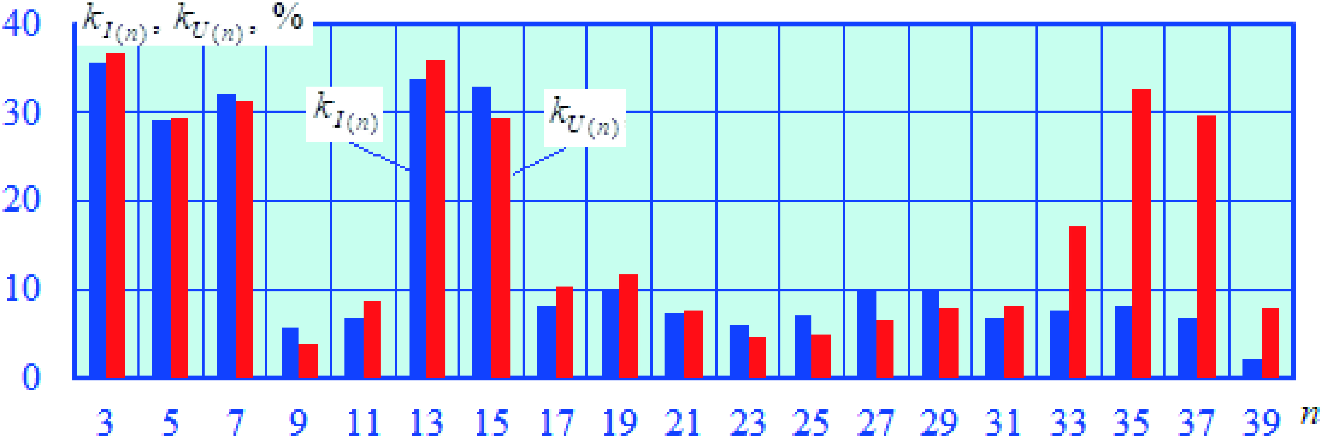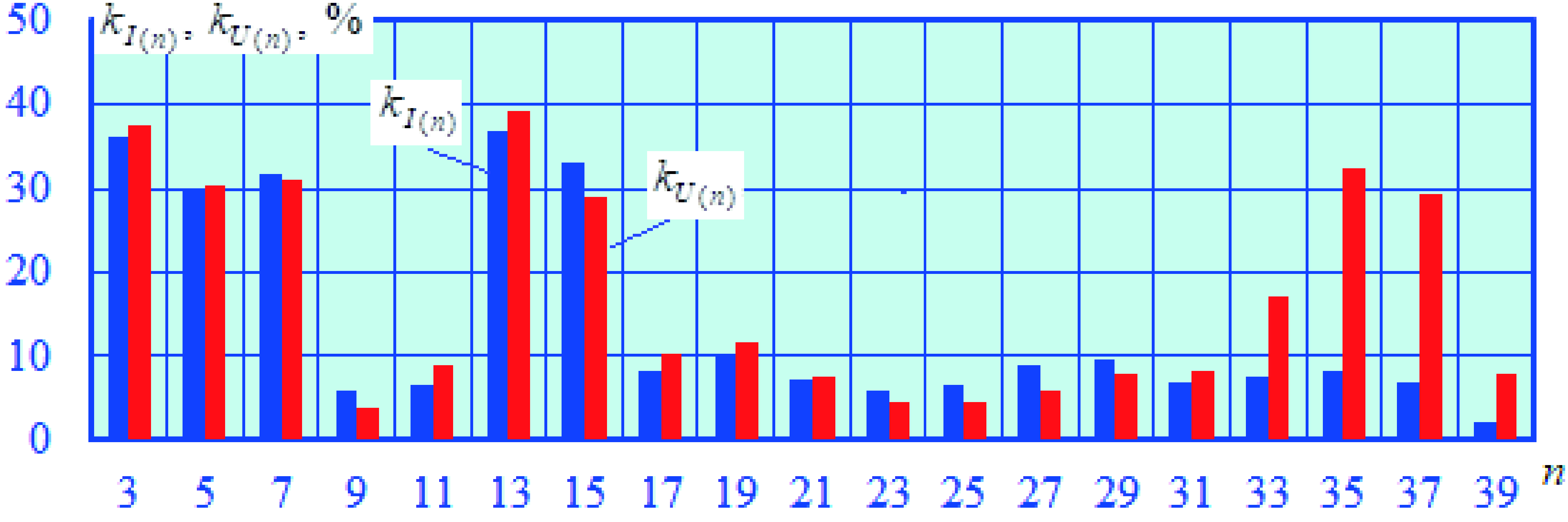 Величины kU (n) по сравнению с режимом, когда нейтраль изолирована, существенно уменьшились (рис. 13). Для гармоник под номерами 3, 7 и 15 коэффициенты kI (n) лежали в диапазоне 2,5…5,6 % от основной.