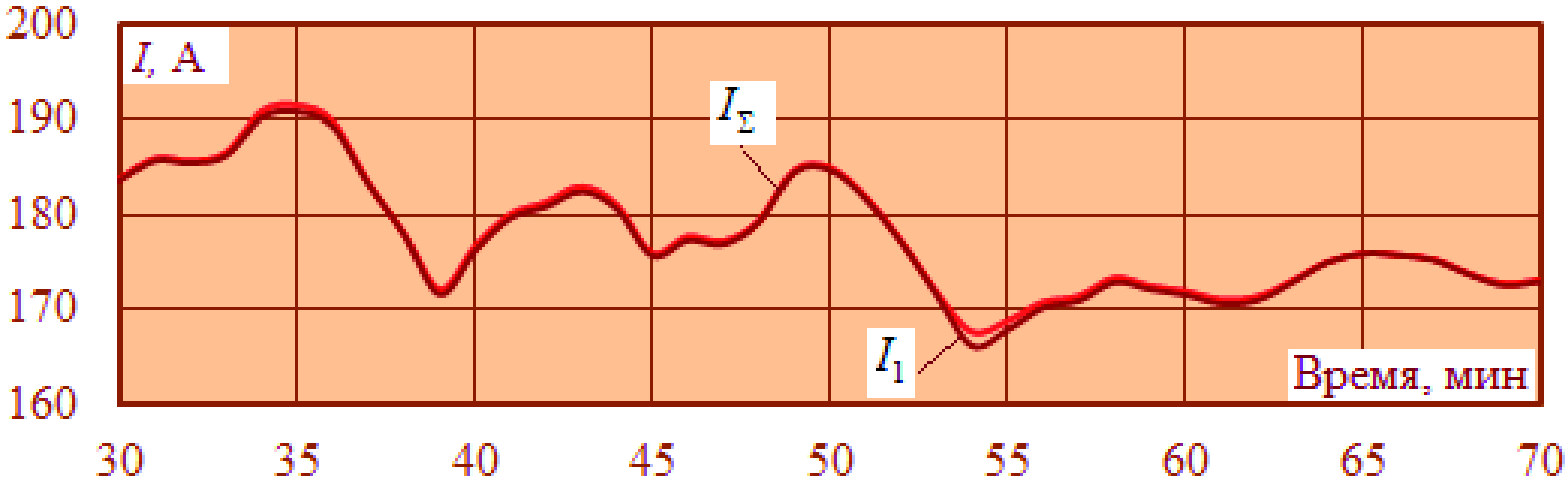 Напряжения фиксировались в точке, отвечающей расстоянию в 10 км от подстанции ТП 1. Полученные результаты показали, что из-за влияния тяговой сети (ТС) наблюдаются колебания фазных напряжений основной частоты; при этом по фазе А коэффициент вариации достигал семи процентов, а размах равнялся 1670 В.