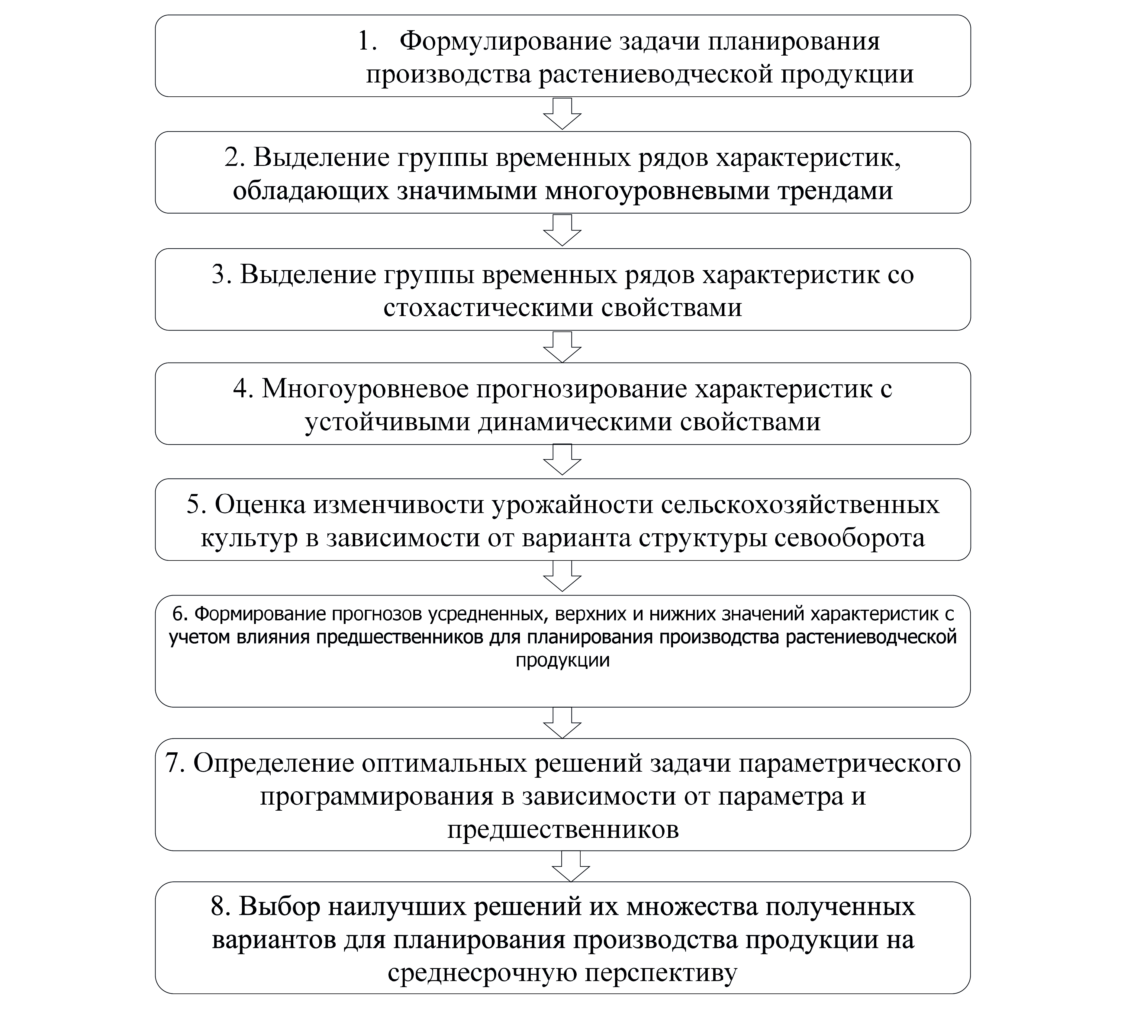 На первой стадии определяются целевая функция и ограничения модели. В качестве целевой функции использован максимальный доход. Вторая операция связана с оценкой значимых многоуровневых трендов в многолетних рядах коэффициентов, входящих в левую часть ограничений. На третьем шаге определяются стохастические ряды и оцениваются вероятности усредненных уровней всего ряда и локальных экстремумов. На четвертом шаге на основании полученных многоуровневых трендов осуществляется прогнозирование производственно-экономических характеристик. При этом в частном случае некоторые характеристики принимаются в качестве усредненных [7]. Следующая операция позволяет оценивать влияние предшественников на урожайность сельскохозяйственных культур, осуществляется корректировка значений прогнозов в зависимости от схемы севооборота. После получения прогнозных значений и оценки влияния предшественников формулируются варианты входных данных. Седьмой операцией является определение оптимальных решений параметрической задачи с учетом прогнозов для усредненных, благоприятных и неблагоприятных условий и влияния различных сочетаний предшественников. На второй стадии осуществляется выбор наилучшего оптимального решения из результатов решения параметрической задачи для планирования производства продукции на среднесрочную перспективу.