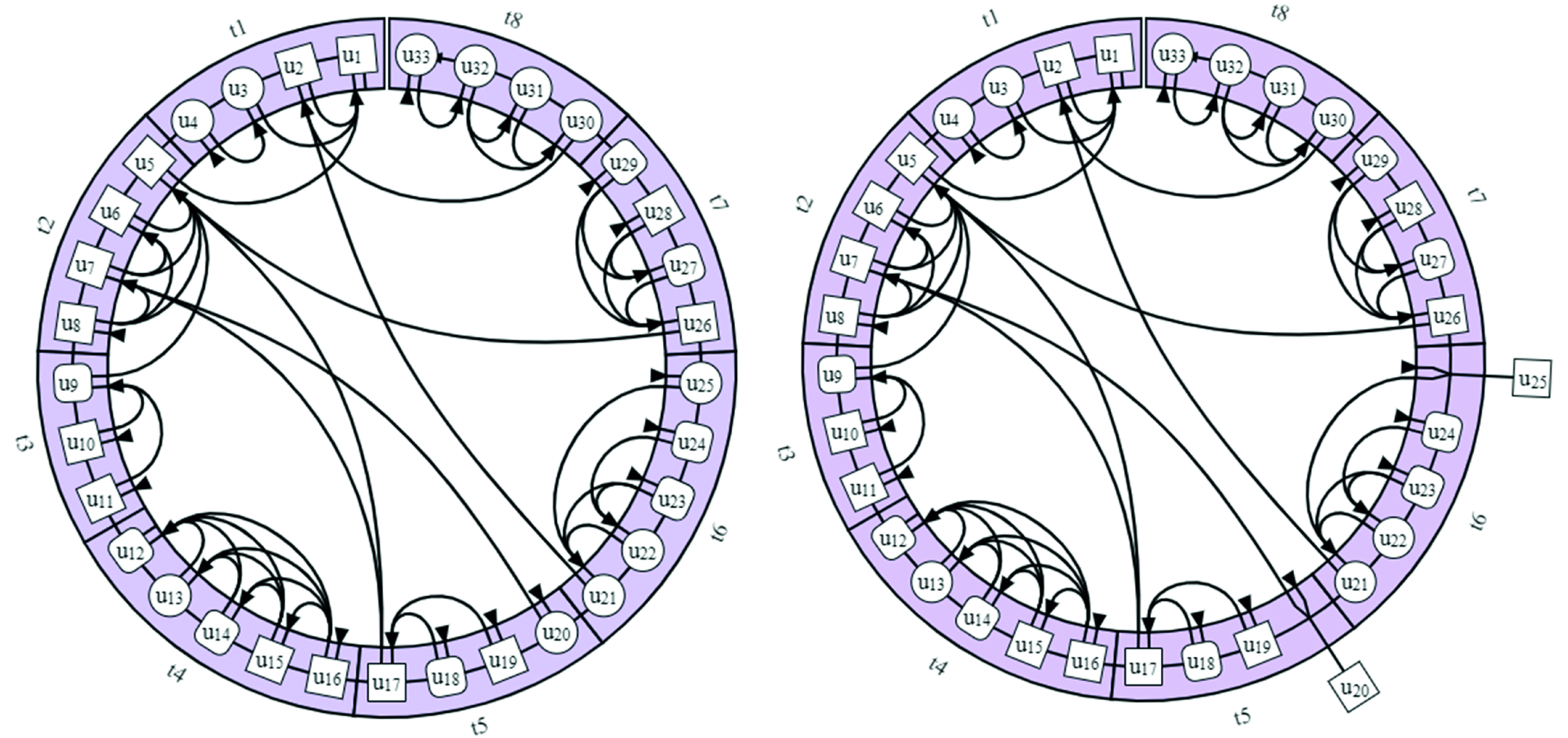 Метод когнитивных карт диагностики знаний. ККДЗ – это метод составления когнитивных карт (картирования), осуществляющий компактное представление (визуализацию) семиотических структур (данных о синтактике, семантике и прагматике) в приложении к диагностике знаний об экземпляре какого-либо объекта или выполняемого им процесса (денотат) с целью повышения качества процесса принятия решений и их аргументированности [6]. Примеры карт в различных режимах приведены далее на рис. 2-4 и 6. Каждый элемент карты (квадрат ui) соответствует дидактической единице, а его раскраска – оценке степени её освоения в знаниевом или одном из компетентностных аспектов (в зависимости от выбранного): зелёный – полностью освоен, красный – совсем не освоен, белый – граница неопределённости, серый – не укомплектован измерительными материалами. За счёт того, что в этой графической нотации совмещены синтактическая (структурная) составляющая (дидактический материал ui расположен по кругу в соответствии с исходной образовательной траекторией) и семантическая (соответствующие причинно-следственные связи внутри круга), такое представление позволяет сформировать целостный образ сложившейся учебной ситуации. Рассмотрим пример на базе одной из учебных дисциплин «Методология научной деятельности», состоящей из 33-х дидактических единиц. Базовая карта этого курса ориентирована на отражение структуры учебного материала (левая часть с рис. 2), а частная карта адаптируется под индивидуальный образовательный запрос конкретного учащегося (см. правую часть). Для дополнения этой конструкции элементами прагматики (для довершения построения сущности по квадрату Поспелова из подхода прикладной семиотики [10]) используется другая нотация – сквозная карта, о которой можно подробнее прочитать в [11] (далее для иллюстрации данной статьи нам эти нотации ККДЗ не понадобятся).