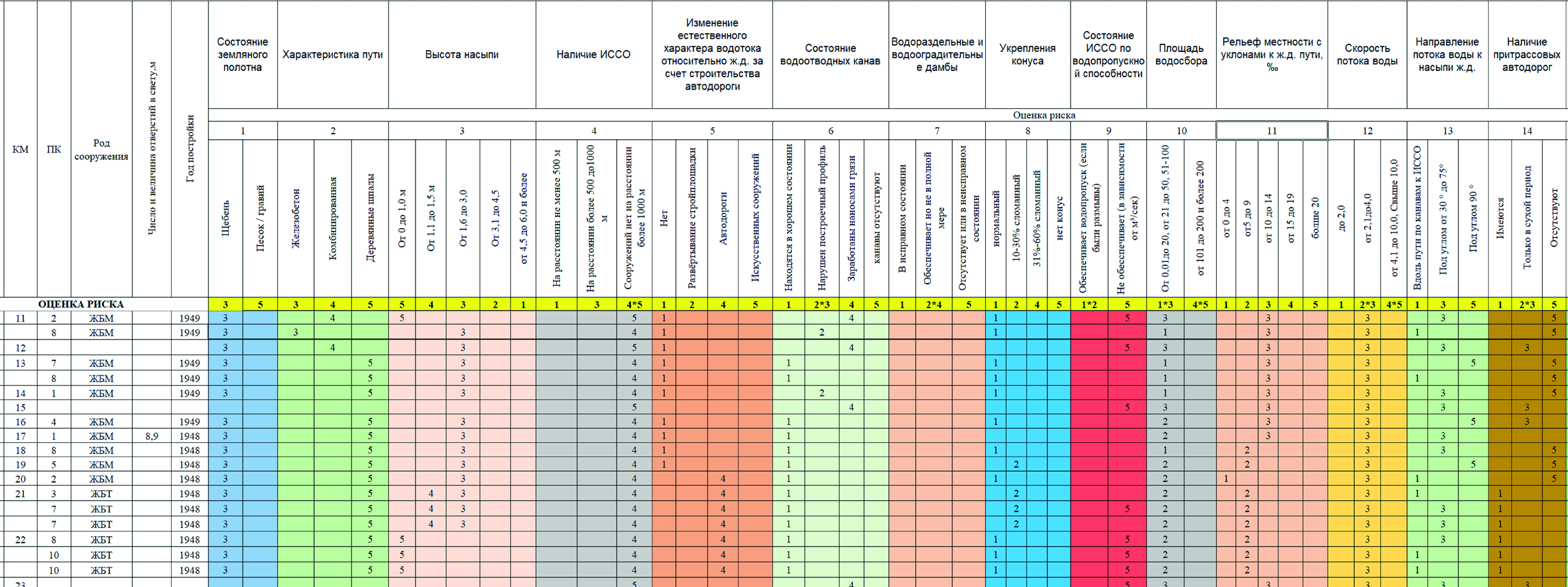 Основанная на такой модели угроз система поддержки принятия решений (СППР) изначально была реализована в простейшей форме в виде электронной таблицы, в которую с покилометровым интервалом заносятся сведения о характеристиках d (Xi) и k (Xi) (рис. 2, цветом отмечены характеристики). После покилометрового расчёта показателя D (t) строки, соответствующие значимой величине угрозы для заданного момента времени, выделяются цветом согласно вышеуказанной схеме: жёлтым (средний уровень угрозы), оранжевым (высокий уровень) и красным (очень высокий уровень). Зелёный уровень не выделяется, чтобы не отвлекать внимание.