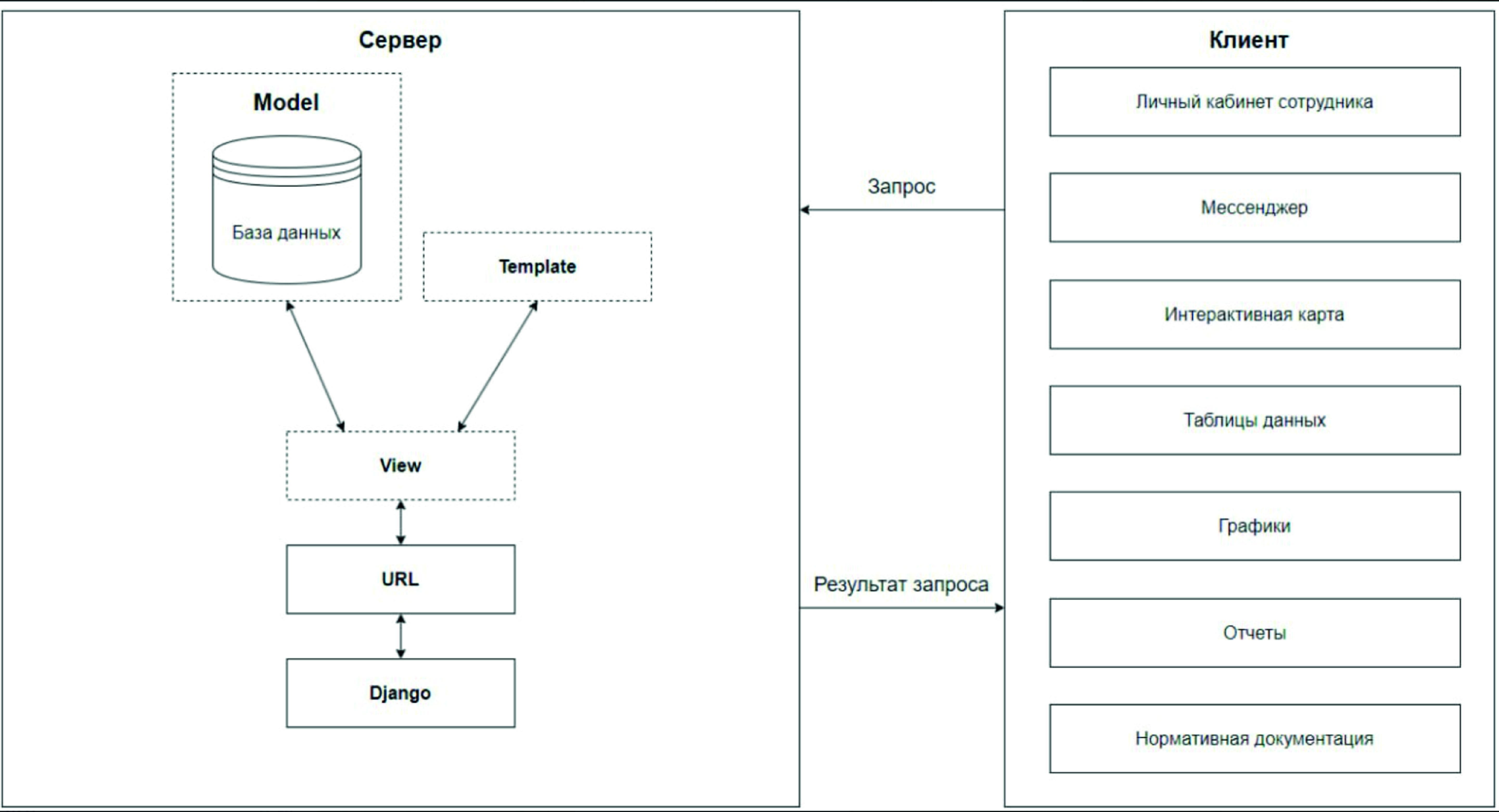 Архитектура веб-приложения клиент-серверная, где клиенты – рабочие компьютеры, через которые пользователи отправляют запросы, а сервером является отдельная машина, обрабатывающая запросы пользователей, например, отображения информации на карте о рисках размыва, загрузка новых данных, введенных пользователями. Такая архитектура позволяет работать с веб-приложением нескольким пользователям (рисунки 3, 4). Серверная часть реализуется на Django. Система содержит компоненты: