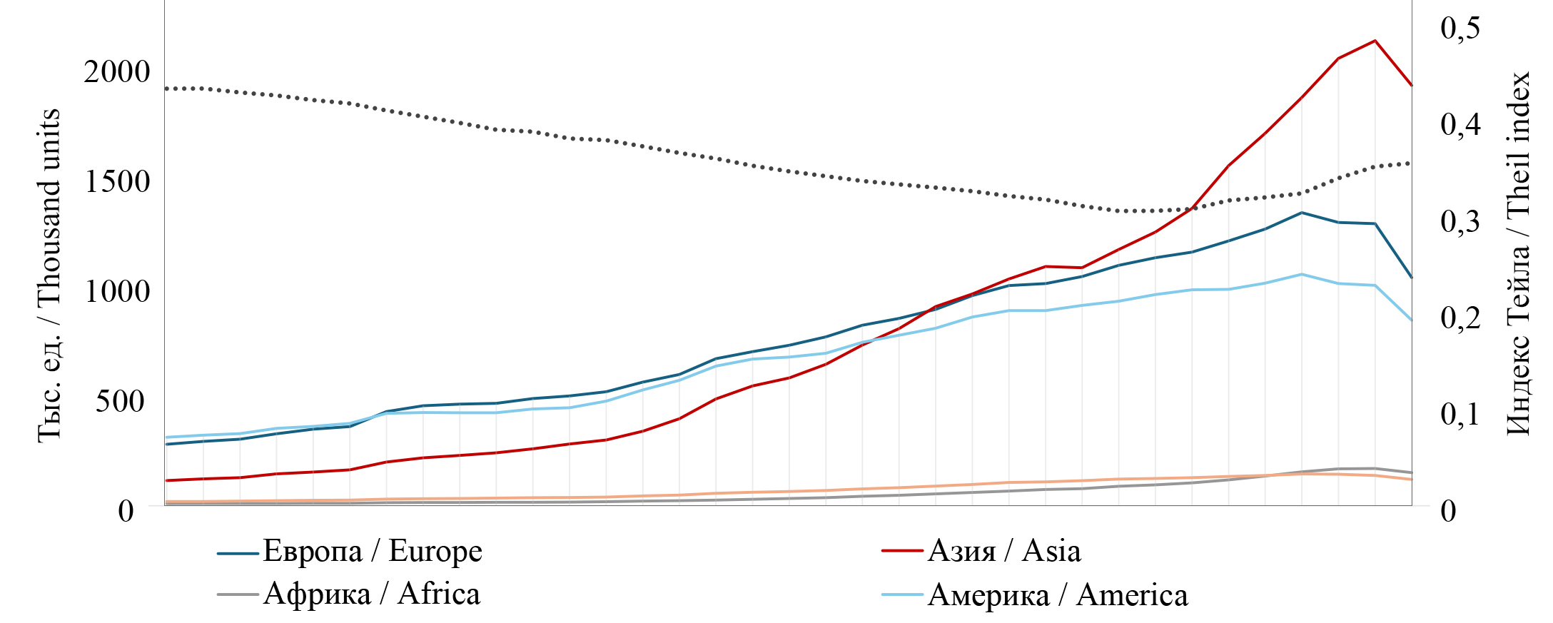 где T – индекс Тейла; N – количество макрорегионов; Xi – сумма i-ого наблюдения количества публикаций; – среднее значение количества публикаций.