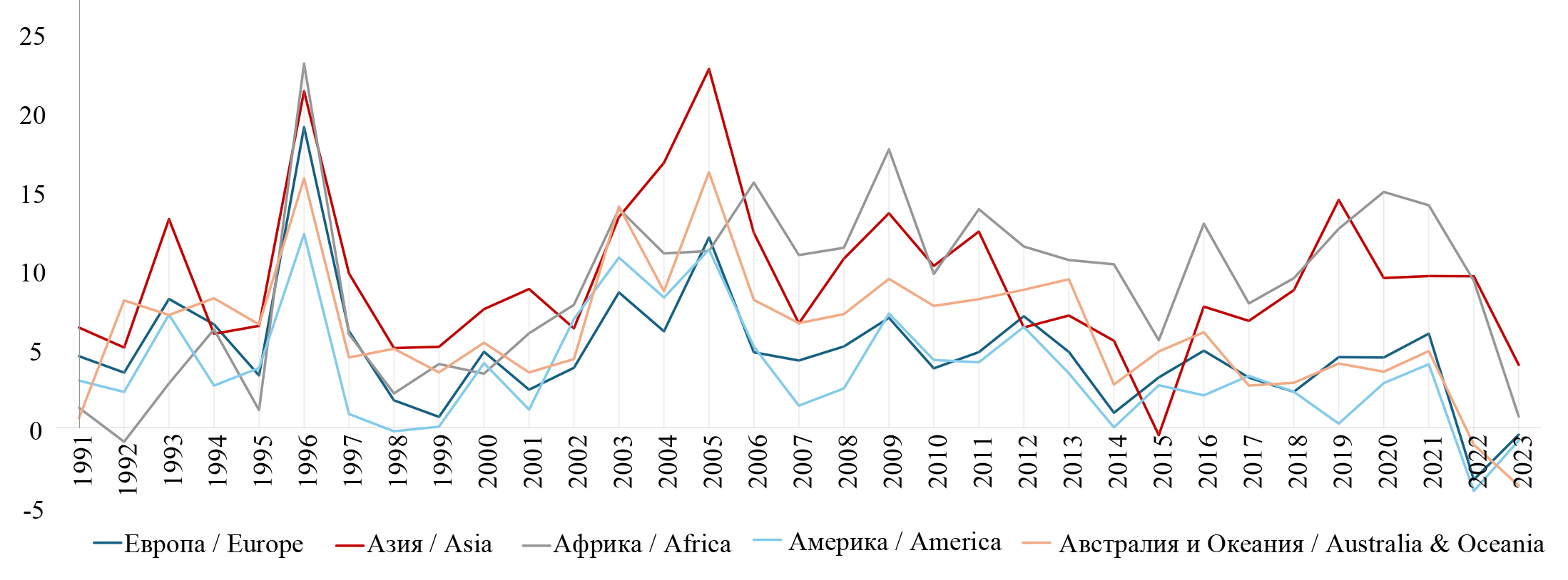 Рис. 2. Цепные темпы прироста/снижения научных публикаций, индексируемых в Scopus, в разрезе географических макрорегионов в 1991–2023 гг., %