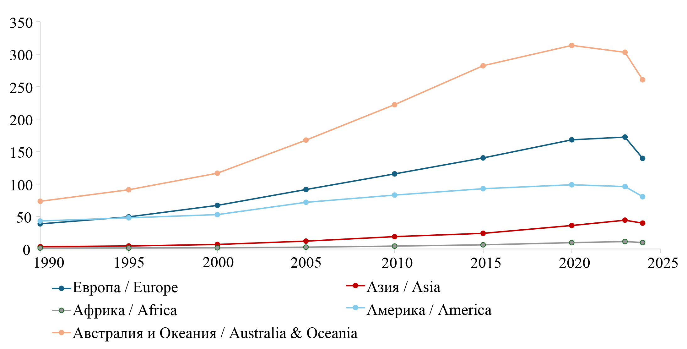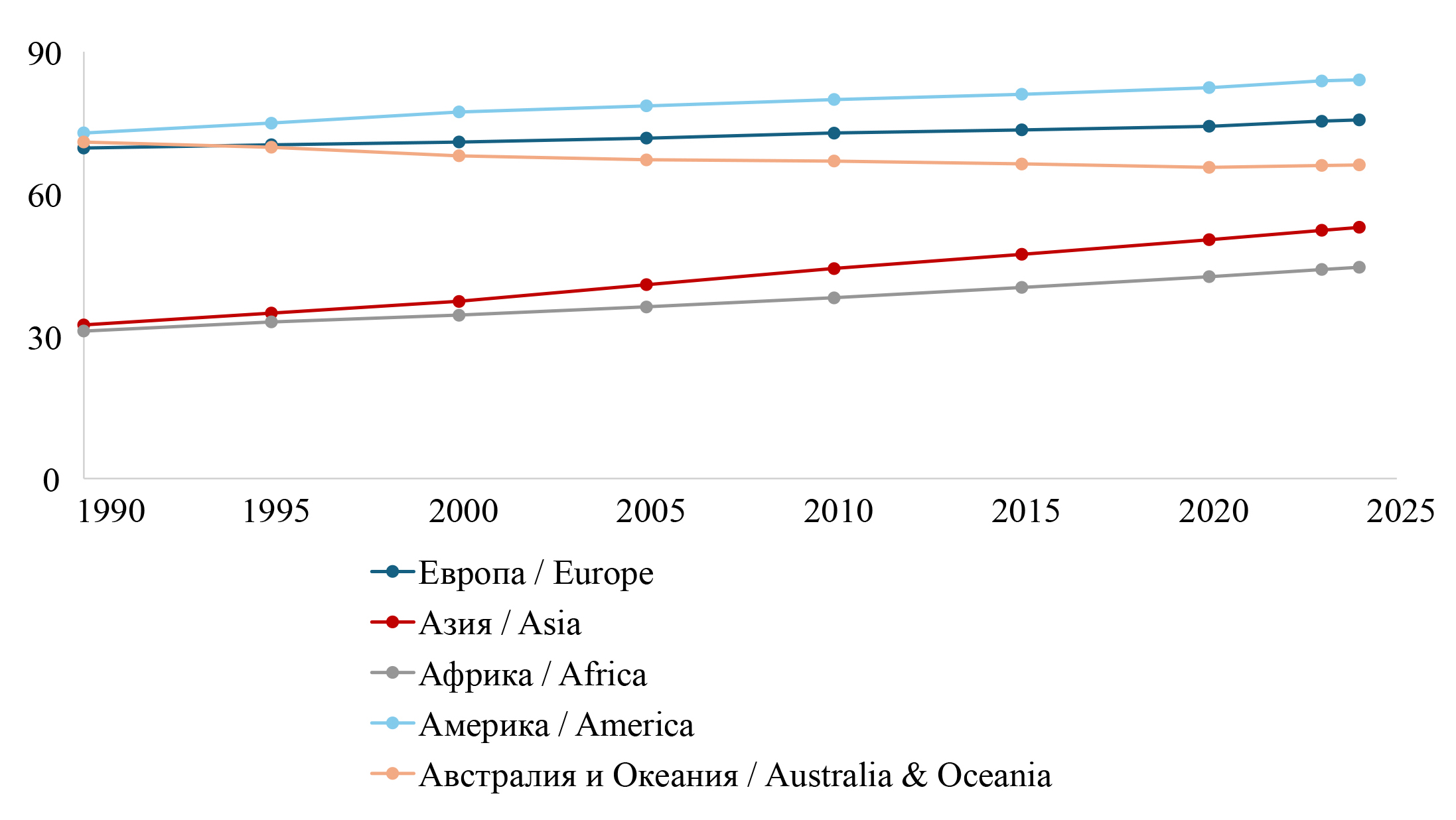 При взвешивании количества публикаций на численность населения в региональном разрезе лучшие значения научной продуктивности показали макрорегионы с преобладающей (свыше 60 %) долей горожан, а именно – Америка, Европа, Австралия и Океания, имевшие в 2023 г. 96, 172 и 303 публикации на 100 тыс. чел. соответственно (рис. 3). Коэффициент корреляции между массивами показателей научной продуктивности и удельного веса городского населения по макрорегионам в 1990–2024 гг. равен 0,544, что свидетельствует о прямой средней[7] силе связи между ними. Более интенсивный переток людей в города стал конкурентным фактором в макрорегиональном масштабе для интенсификации научно-технологического развития.
