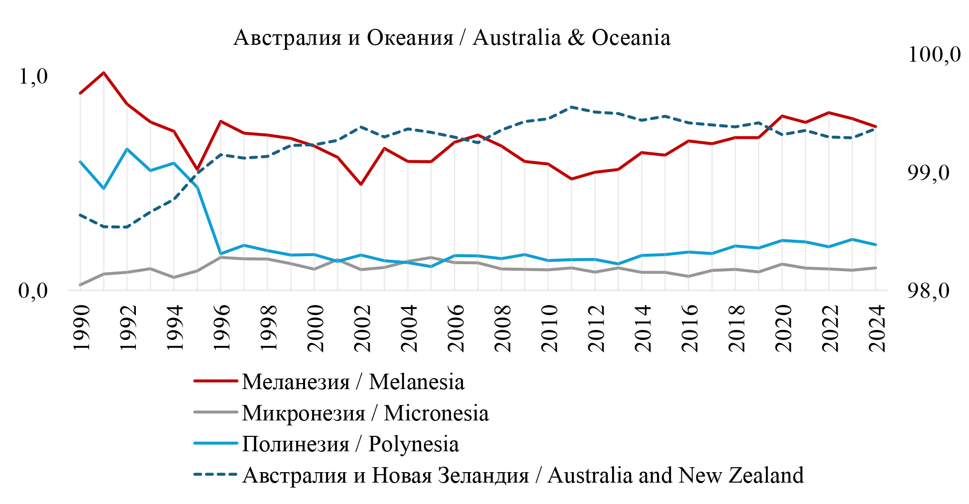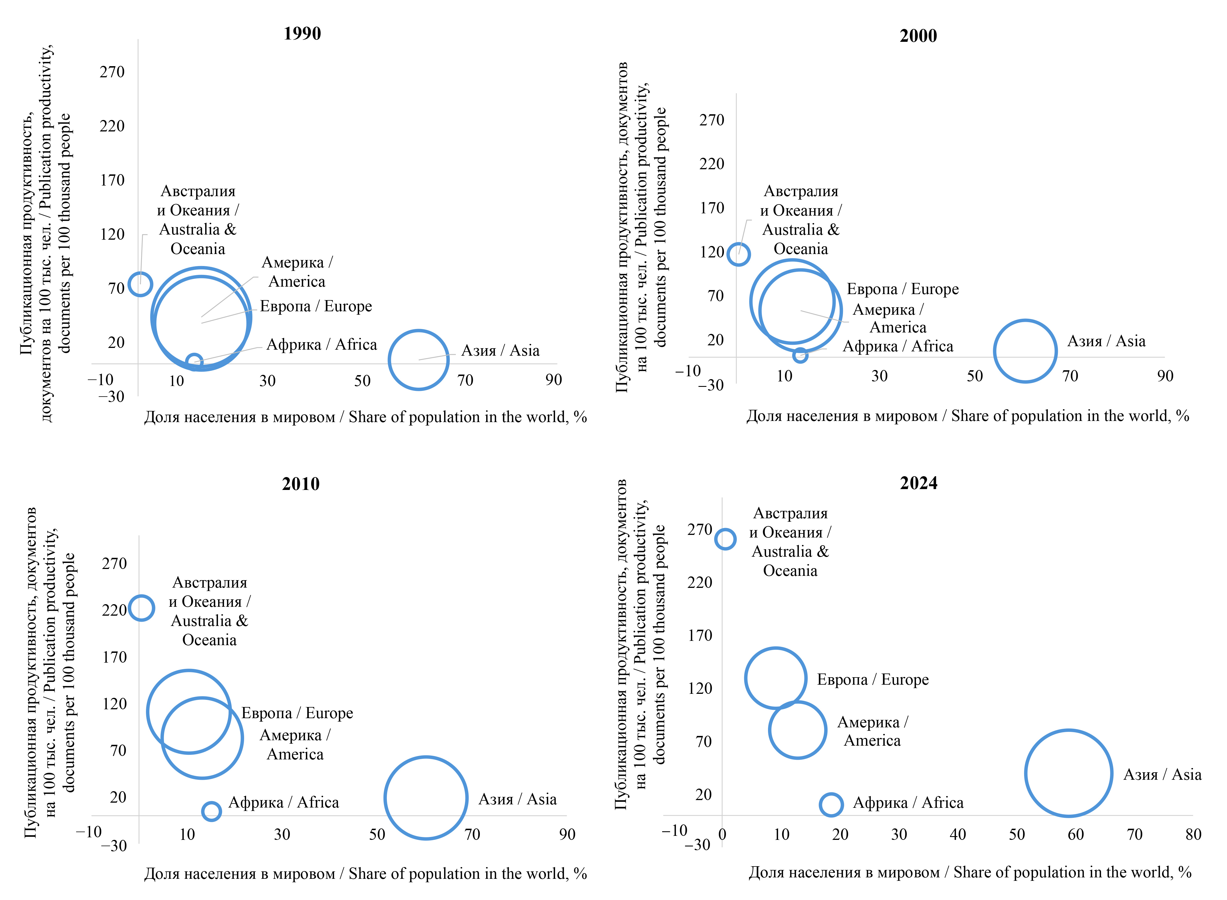 Представляет интерес изменение в мировом масштабе научных позиций еще двух макрорегионов – Африки, Австралии и Океании. В течение рассматриваемого периода доля австралийского макрорегиона в общемировом объеме научных публикаций (около 3 %), как и в структуре распределения мирового населения (около 0,5 %), практически не менялась. В то же время регион значительно нарастил свою публикационную продуктивность: с 73,5 до 260,0 публикаций на 100 тыс. чел. населения, демонстрируя интенсивную модель развития. Африканский макрорегион, обладая существенно большим объемом человеческих ресурсов (в 1990 г. превзойдя только Австралию, а в 2024 г. уступив лишь Азии), характеризуется наиболее низкой эффективностью их вовлечения в процесс генерации нового научного знания. Однако Африке даже при имеющейся динамике удалось улучшить свою видимость на мировой научной карте в рассматриваемом периоде: за 34 года доля макрорегиона относительно мира по количеству публикаций увеличилась с 1 до 4 %.
