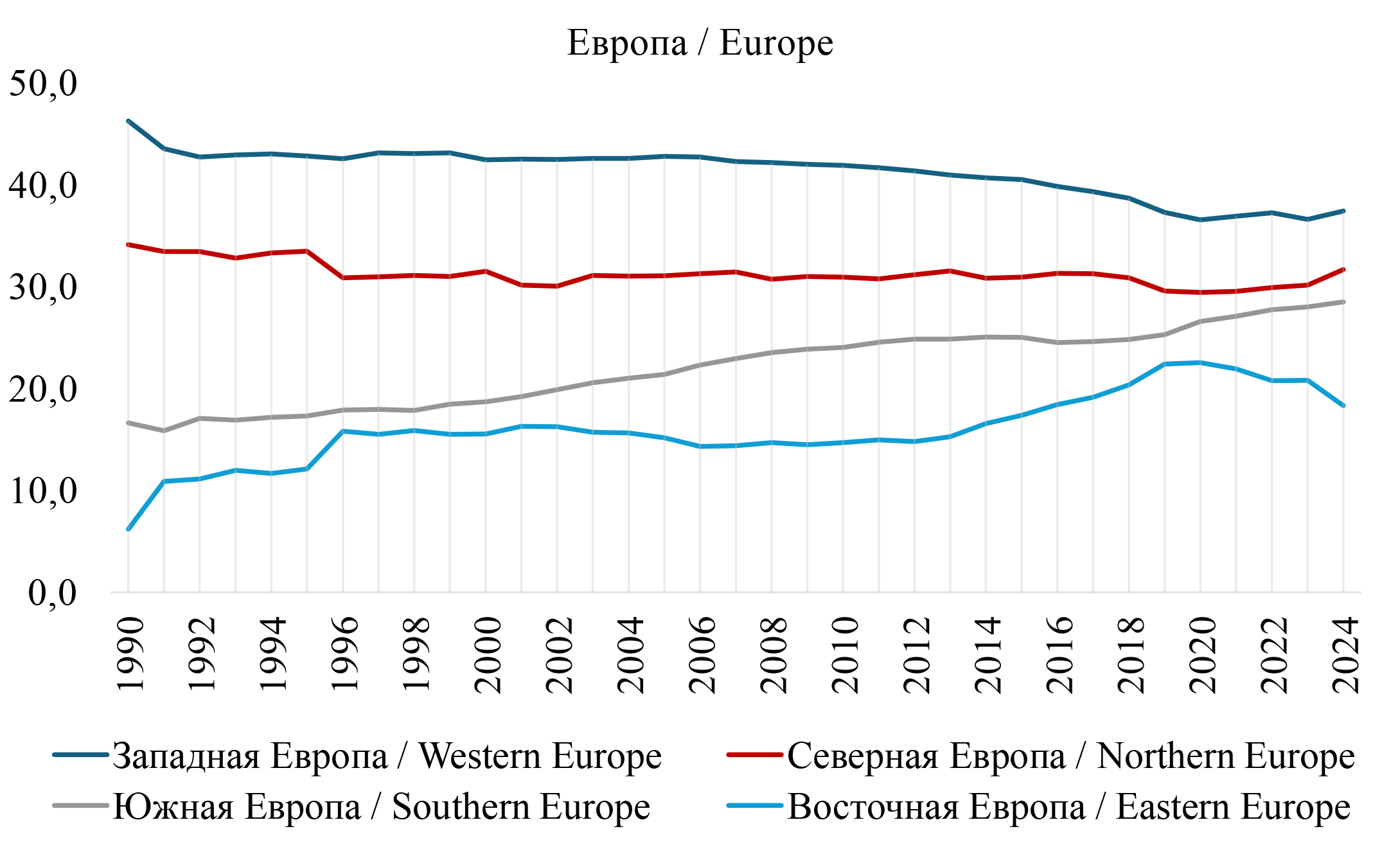 В Европе лучшие показатели публикационной активности у Западной Европы (средняя доля мезорегиона в 1990–2024 гг. – 40,4 %), на втором месте Северная Европа (30,9 %), на третьем – Южная (23,7 %), наименьший вклад у Восточной Европы (17,3 %). Данное распределение сохраняется в течение последних 34 лет. При этом если доля Западной и Северной Европы из года в год снижается, то Южная и Восточная Европа, напротив, наращивают публикационные возможности (в случае Восточной Европы это происходит «рывками»).