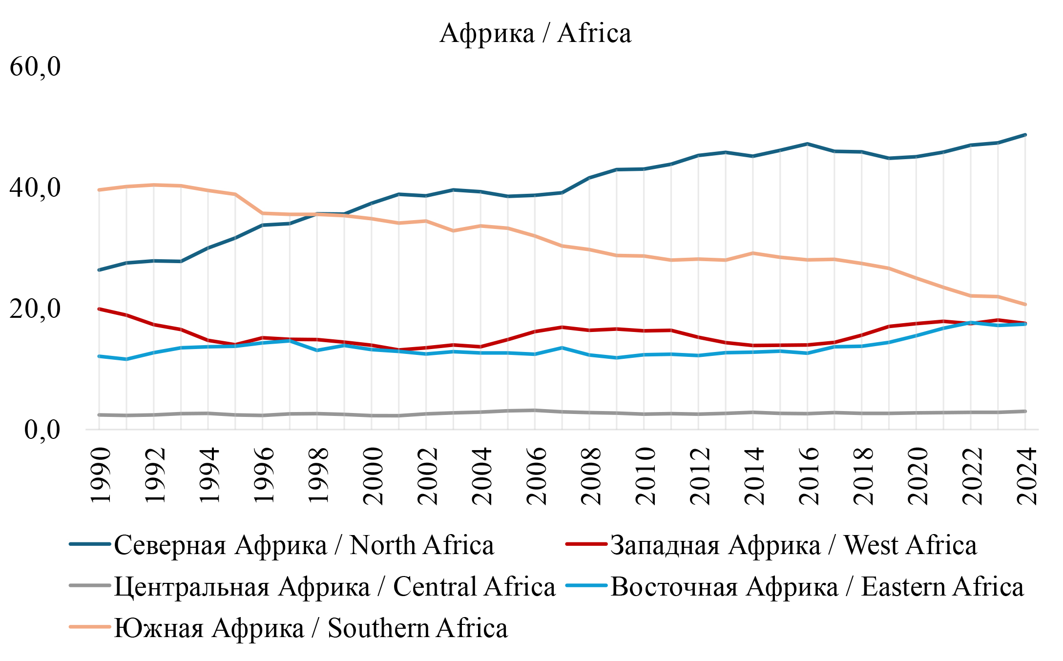 Отличие африканского макрорегиона от европейского заключается в менее стабильной структуре распределения публикационной активности в 1990–2024 гг. со сменой лидера (с 1998 г. Южная Африка уступила первое место по доле научных публикаций Северной Африке, которая смогла укрепить свои позиции). К 2024 г. география центров производства знания в Африке имела следующий вид: ежегодно нескольким менее 50 % научных публикаций приходилось на Северную Африку, по 17–20 % – на Западную, Восточную и Южную Африку. Центральная Африка сохраняет периферийное положение (менее 3 %).