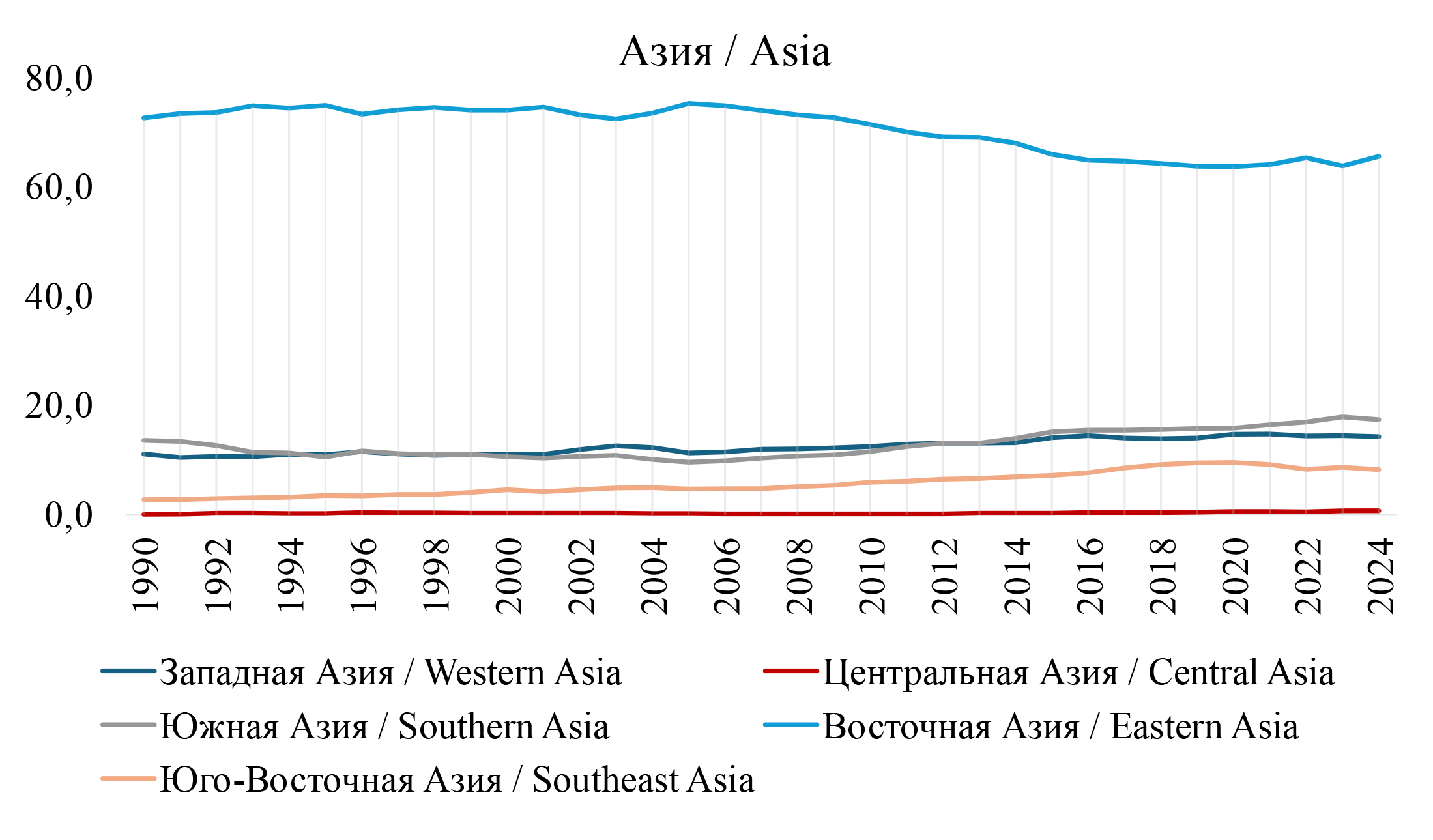 Если в Европе и Африке сложилось более равномерное распределение производства научного знания, то для Америки, Азии, Австралии и Океании характерно выделение одного ведущего по доле научных публикаций мезорегиона относительно остальных, а именно Восточной Азии, Северной Америки, Австралии и Новой Зеландии. В последние 30 лет отмеченные мезорегионы задают динамику процесса генерации научного знания в своих макрорегионах: в среднем на них в 1990–2024 гг. приходилось 67,6; 88,8 и 99,3 % всех публикаций в региональном масштабе. При этом удельный вес Восточной Азии и Северной Америки постепенно снижается. Это происходит за счет роста вклада в общий объем научных публикаций Западной и Южной Азии – в азиатском макрорегионе, и Южной Америки – в американском макрорегионе (рис. 5).