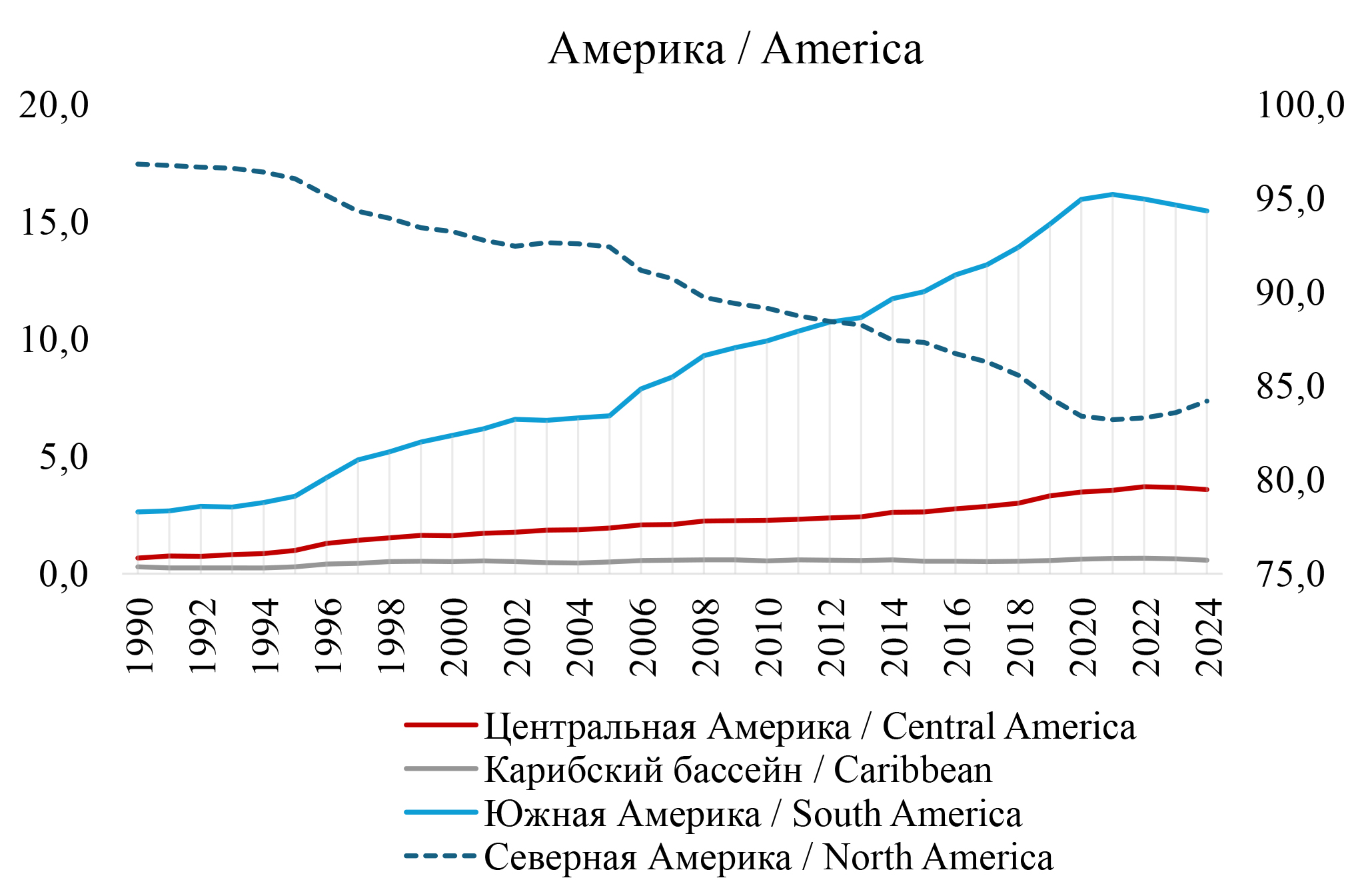Рис. 4. Изменение географии прироста научного знания в разрезе географических макрорегионов в 1990–2024 гг., %[9]