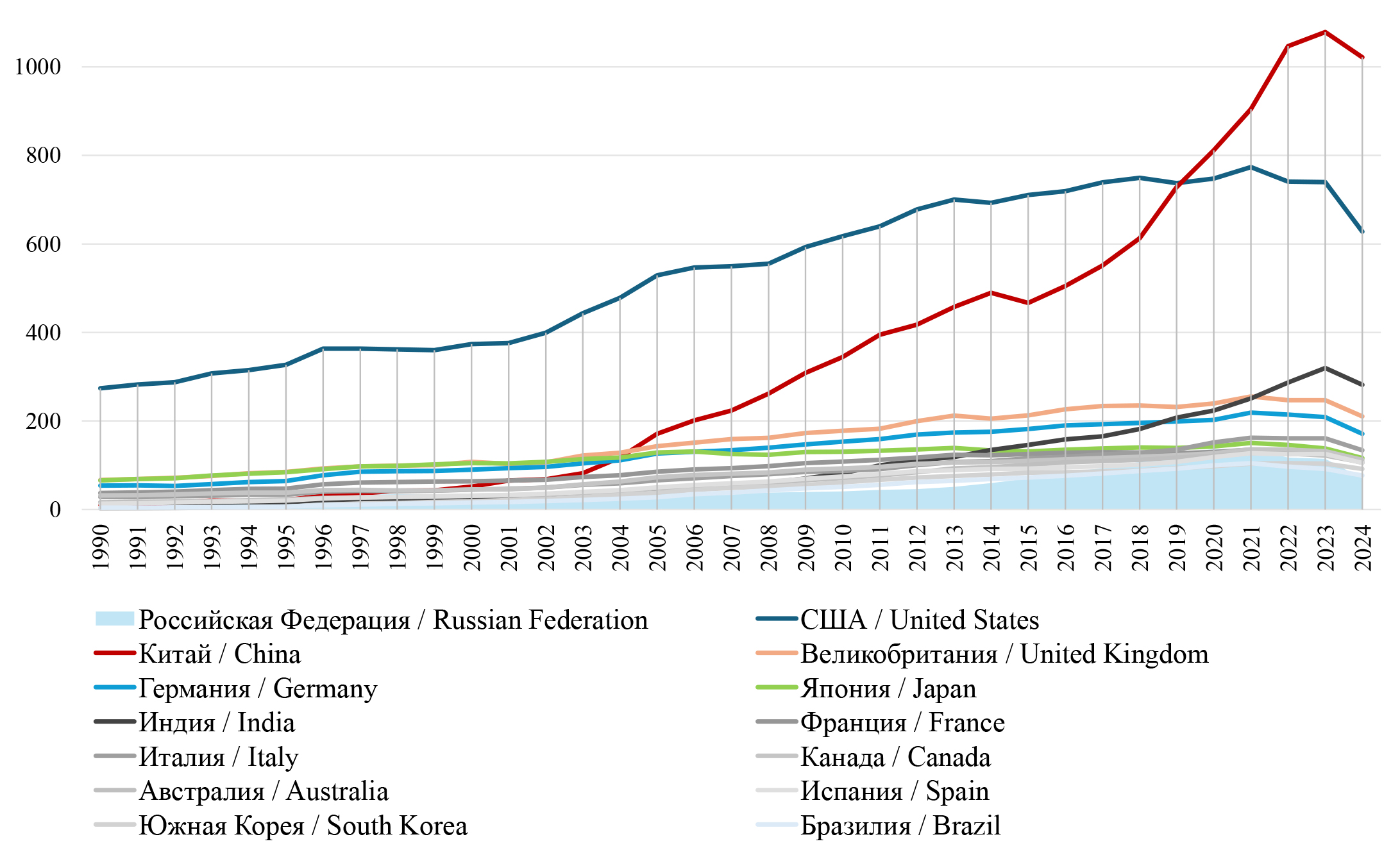 Россия по общему количеству публикаций в международной базе Scopus за весь период (1990–2024 гг.), а это более 1,9 млн документов, или 2,6 %, занимает 12-е место в мире и уступает США, Китаю, Великобритании, Германии, Японии, Индии и другим странам. Для сравнения: по численности постоянного населения Россия занимает 9-е место (2023 г.), а по доле в мировом ВВП по паритету покупательной способности – 4-е место (2024 г.)[14]. Такое распределение указывает на сохраняющиеся у страны как человеческие, так и денежные резервы для стимулирования развития научной сферы.