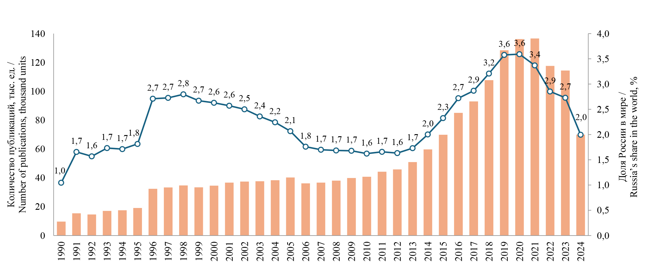 Fig. 7. Dynamics of scientific publications in Russia in 1990–2024