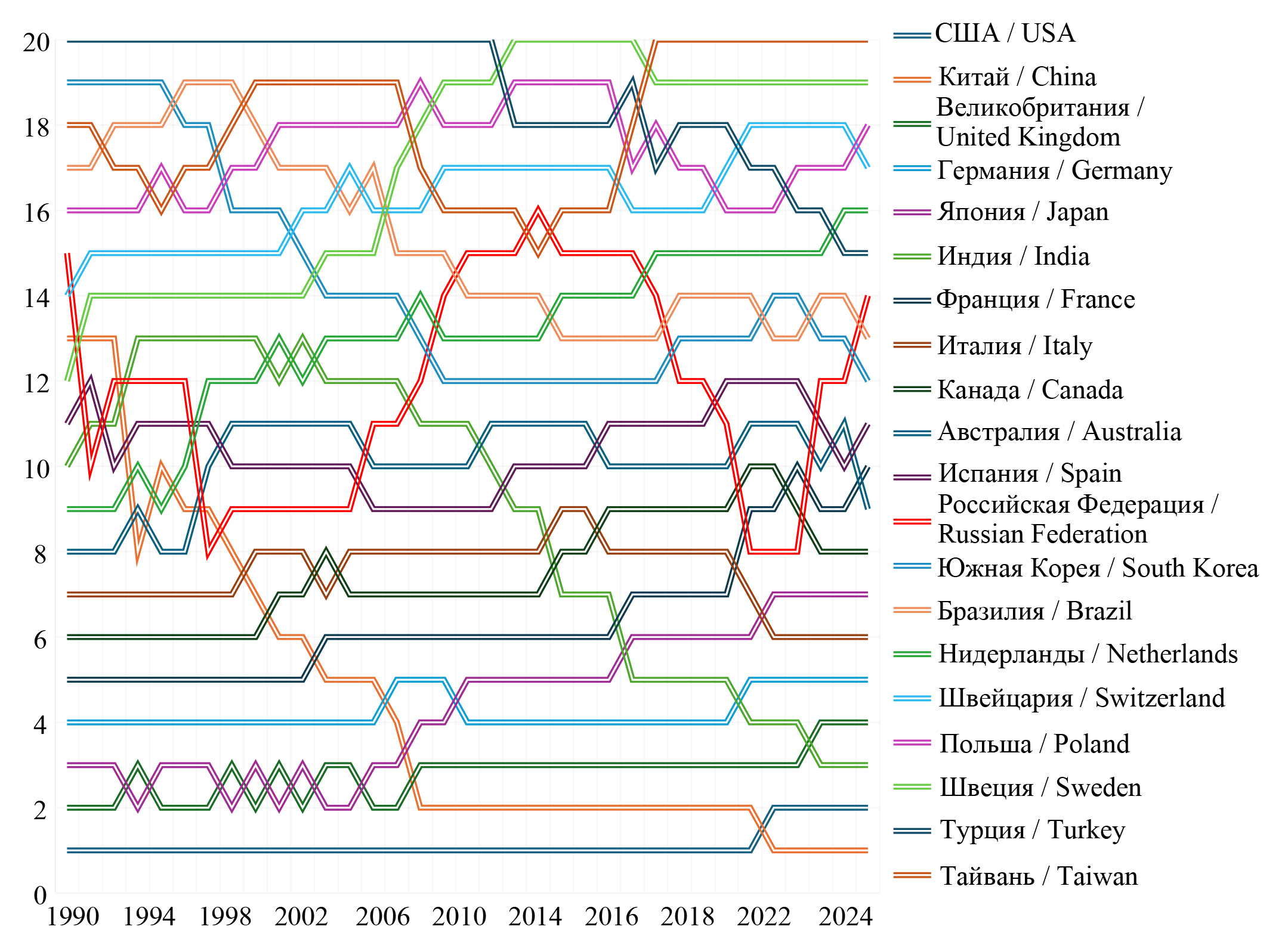 Рис. 8. Изменение рангов в топ-20 стран мира по совокупному количеству публикаций в 1990–2024 гг.[17]