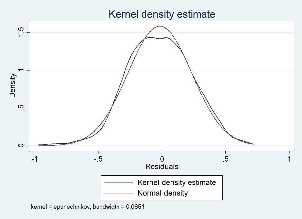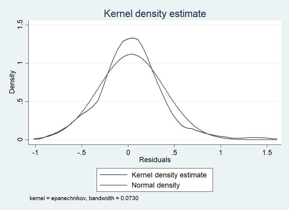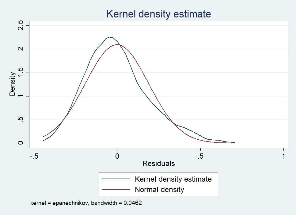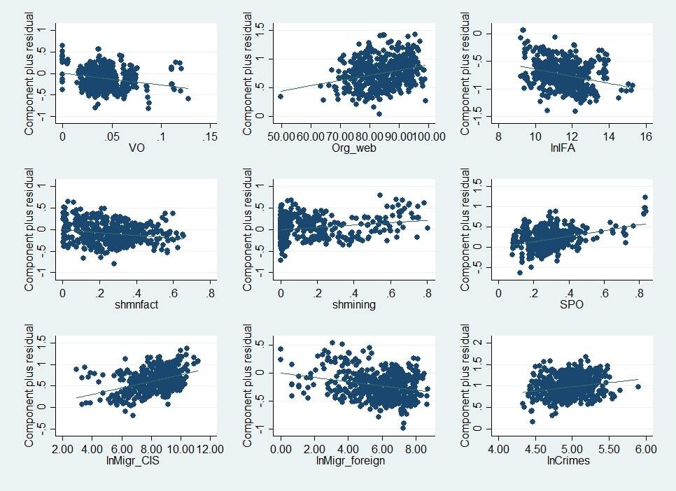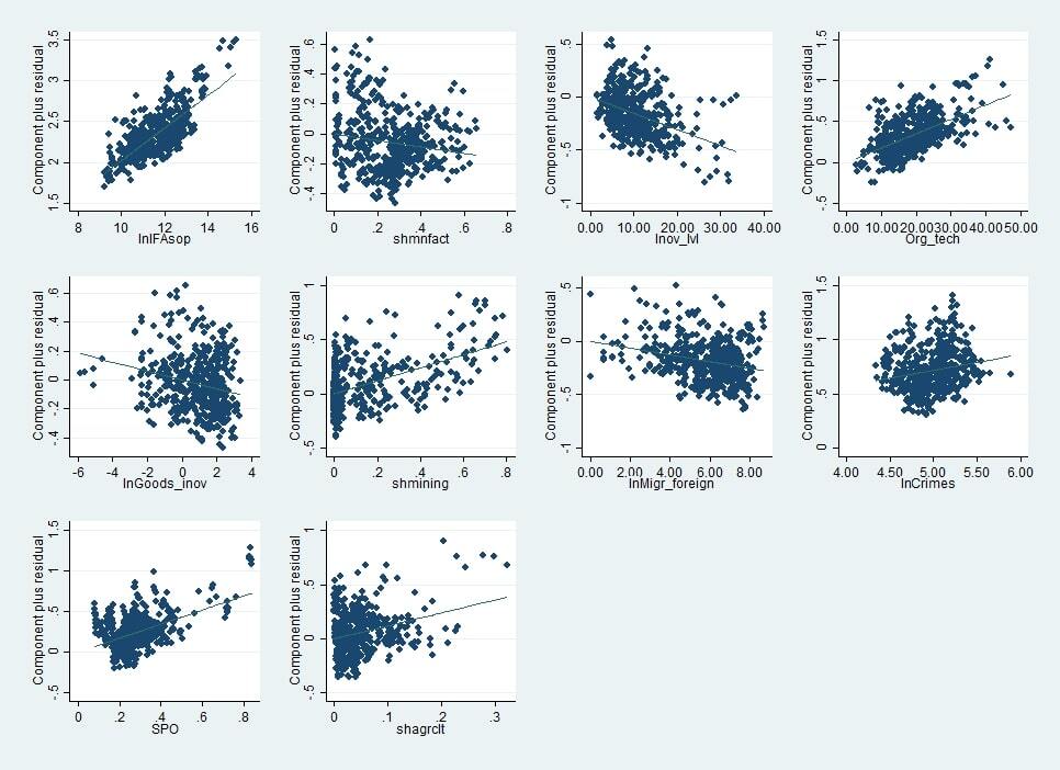 Table 3 shows the results of constructing a linear regression model (Model 1.1), a panel data model with fixed (Model 1.2) and random effects (Model 1.3). The adjusted coefficient of determination of the 1.1 model is 68 %. Testing the model revealed heteroskedasticity in the residuals, necessitating the use of robust estimates for the standard error of the model. The results of the tests for the heteroskedosticity of the residuals for the Model 1.1. are shown in Figure 1. The results of comparing models 1.2 and 1.3 using the Hausman test show that model 1.2 should be preferred. The adjusted coefficient of determination in model 1.2 is 45 %. The inverse relationship is observed in model 1.2 compared to model 1.1. between the lnNWage and shrmnfact and SPO variables.