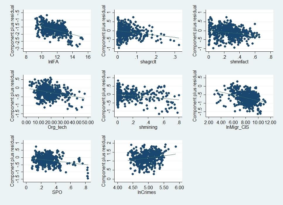 Research shows that technology has a positive impact on wages, and companies that are inclined to invest in technology pay higher wages [29; 30]. Taking into account the previously obtained results on the impact of regional specialization on economic growth [22], we also assume a stronger positive impact of the extractive sector on wages and a negative impact on unemployment. Also, we suggest about negative impact of this factor on variable “Number of departures of the population” because the regions specializing in mining are a point of attraction for people who want to increase their income.