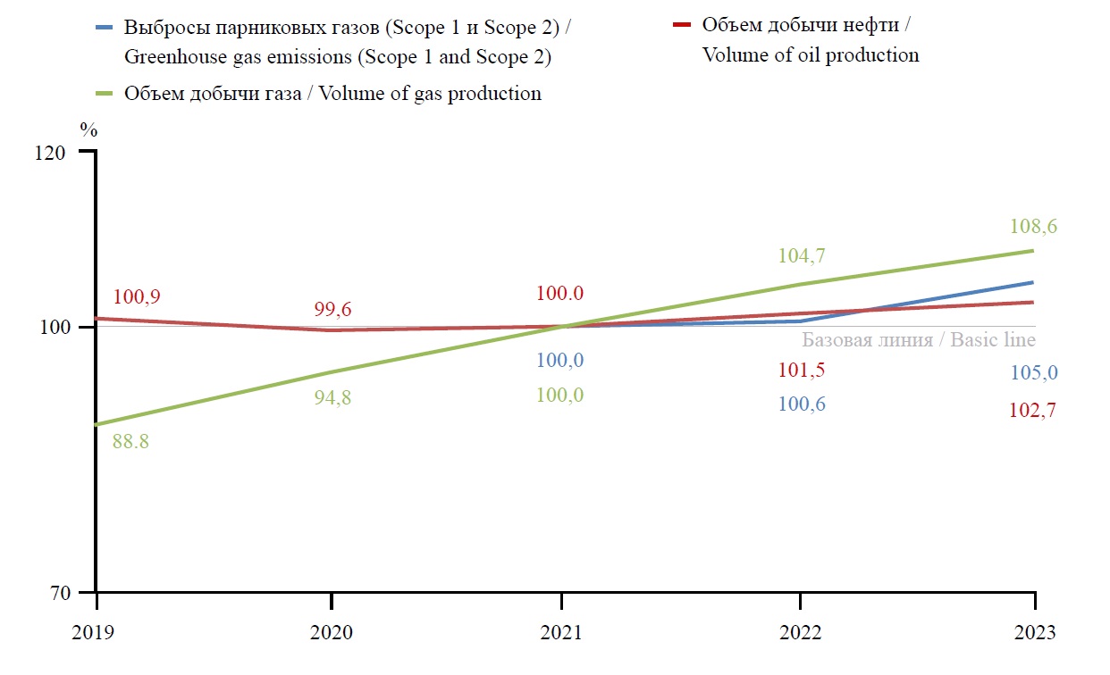 В 2019–2021 годах объемы выбросов парниковых газов Scope 1 и Scope 2 предприятием сократились на 4,5 %, хотя и добыча углеводородов снизилась на 6,8 %. Однако в 2022 году, несмотря на увеличение добычи углеводородов на 10,5 %, выбросы парниковых газов выросли всего на 5,9 %, что стало возможным благодаря уменьшению интенсивности сжигания газа на 16,5 % за счет улучшения внутренних систем утилизации. В 2023 году на фоне понижения добычи углеводородов на 6,6 % произошел рост выбросов парниковых газов на 1,1 % (рис. 1), что обусловлено включением в одноименный кадастр нефтеперерабатывающего завода Jazan производительностью 400 тыс. барр./сут.