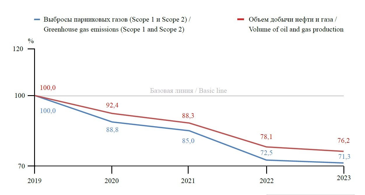 Компания стремится к 2050 году достичь нулевых выбросов парниковых газов Scope 1 и Scope 26; к 2035 – улавливать и хранить до 11 млн т CO2 в год, а также сократить углеродоемкость на 15 % по сравнению с базовым показателем 2018 г. в 9,1 кг CO2 e/бнэ; к 2030 г. – инвестировать в проекты по солнечной фотоэлектрической и ветровой энергии общей мощностью до 12 ГВт.