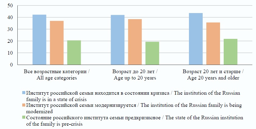 Соответственно, меньшее количество респондентов до 20 лет по сравнению с возрастной группой 20 лет и старше воспринимало состояние института семьи как кризисное (42,1 % и 43,7 %) и как предкризисное (19,4 % и 21,8 %). Такая тенденция свидетельствует о несколько большем влиянии модернистских подходов и ценностных установок индивидуализма на сознание студентов возрастной группы до 20 лет.