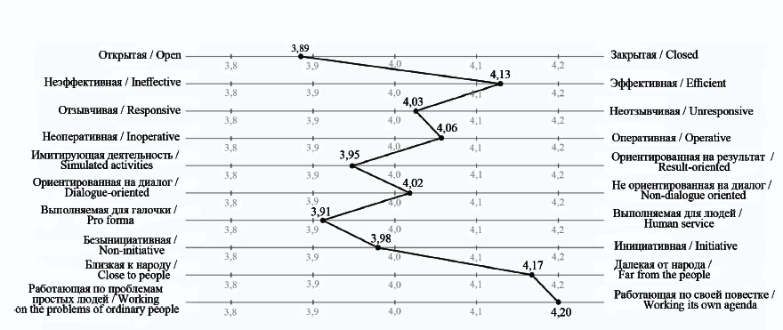 Кроме того использовался метод модифицированного семантического дифференциала для оценки коммуникационной политики губернаторов региона, который позволял измерить ее отражение респондентами с помощью биполярных шкал, полюса которых были заданы следующими антонимами: «отрытая – закрытая», «неэффективная – эффективная», «отзывчивая – неотзывчивая», «неоперативная – оперативная», «имитирующая деятельность – ориентированная на результат», «ориентированная на диалог – не ориентированная на диалог», «выполняемая для галочки – выполняемая для людей», «безынициативная – инициативная», «близкая к народу – далекая от народа», «работающая с проблемами простых людей – работающая по своей повестке». Дополнительно для выявления отношений в системе «гражданин ‒ государство» применялся «Опросник гражданина» О. С. Дейнека [39].