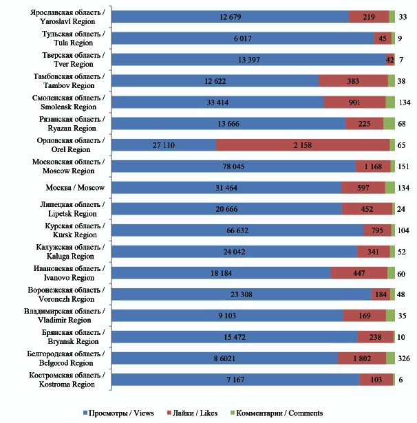 Аутсайдерами по количеству эмоциональных реакций (лайков) выступают два региона – Тверская и Тульская области (рис. 2). Причины таких результатов состоят в том, что паблики губернаторов этих регионов не персонифицированы, а вся информация транслируется подписчикам казенным, формальным языком. К тому же в этих пабликах прослеживается относительно скромное количество появлений персоналий самих губернаторов. Очевидным является дистанцирование руководителей этих регионов от цифрового диалога с населением.