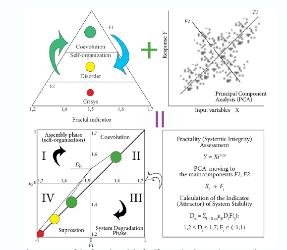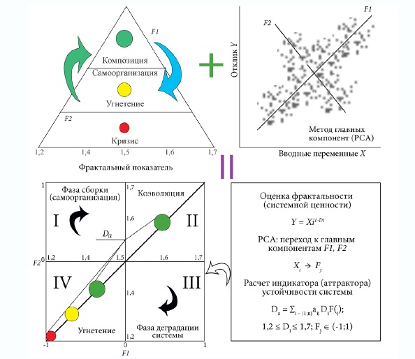 Синтез модели самоорганизации состоит во фрактальном нормировании фазового пространства в структуре метода главных компонент (PCA), переводящем исчисления функциональных переменных (Xi) социально-экономических процессов в структурные (Fj). Состояние системы в условиях конкуренции факторных нагрузок (Fj) определяет цикл системного развития через механизм самоорганизации и оценивается аттрактором в биполярной системе координат фазового пространства.
