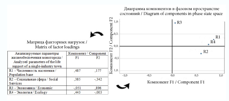 Следующий этап оценки состояний и ранжирования связан с получением матрицы факторных нагрузок и оценкой весовых коэффициентов параметров жизнеобеспечения, способствующих их сбалансированности и структурированию в фазовом пространстве состояний. Для этого используется плагин метода главных компонент (PCA) в структуре SPSS. Эта процедура позволяет перейти от разнородных параметров процессов жизнеобеспечения Ri, представленных в различных измерительных шкалах, к факторным переменным F1, F2 и оценить их корреляцию в фазовом пространстве состояний.