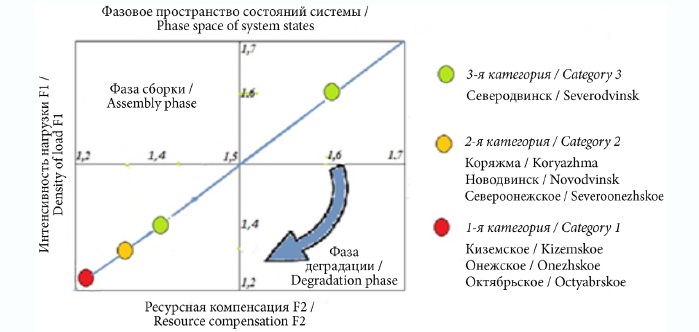 Методика факторного ранжирования позволяет структурировать социально-экономические процессы в фазовом пространстве состояний и выделять факторы риска социально-экономического развития моногородов, которые тормозят социально-экономические процессы вплоть до их стагнации, когда система переходит в неустойчивость. Такие состояния характерны для моногородов 1-й категории, в которых деятельность градообразующих предприятий либо прекращена, либо находится в крайне неустойчивом состоянии, а диверсификация экономики не производится.