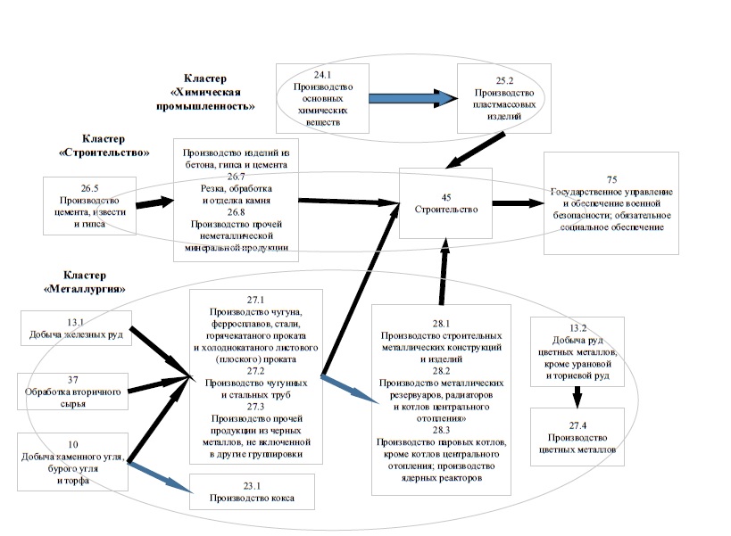«Производство пластмассовых изделий» (25.2) является главным потребителем отрасли «Производство основных химических веществ» (24.1). В свою очередь, отрасль «Производство основных химических веществ» (24.1) – главный поставщик сырья для отрасли «Производство пластмассовых изделий» (25.2). Сильная связь между отраслями позволяет сделать вывод о существовании кластера «Химическая промышленность». Таким образом, данная цепочка взаимодействия отраслей объединяет следующие кластеры: «Металлургия», «Строительство», «Химическая промышленность» (рис. 4).
