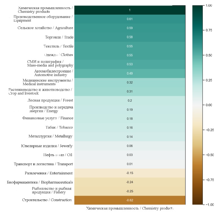 Далее пространственный анализ кластера «Химическая промышленность» осуществляется с помощью расчета коэффициентов корреляции между логарифмированным коэффициентом локализации кластера «Химическая промышленность» и остальными выделенными авторами кластерами на территории Российской Федерации (рис. 6). Анализ проводится с помощью языка программирования Python.