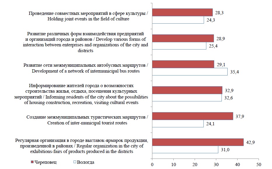 “In your opinion, what areas of interaction should be developed between the city of Vologda and its adjacent districts?”, % of respondents