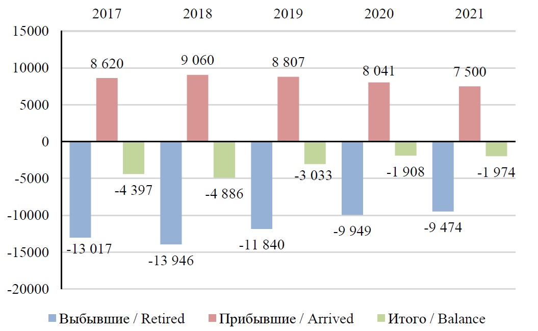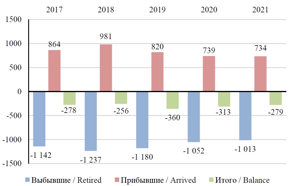 В выводах по демографическим показателям используются «витрины данных» Федеральной службы государственной статистики: «Число прибывших по полу, возрасту и потокам передвижения»12 и «Число выбывших по полу, возрасту и потокам передвижения»13. В статье данные представлены с 2017 по 2021 г. включительно. Однако показатель межрегиональной миграции не тождественен «образовательной миграции», так как указаны миграционные показатели без выделения причин, побудивших к миграции [18, c. 279].