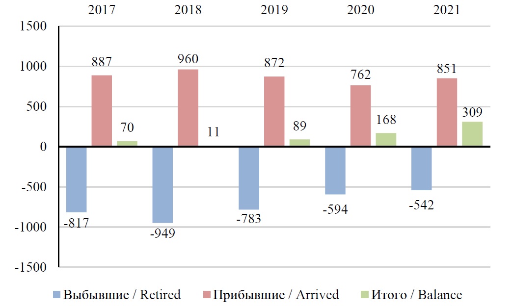 Fig. 1. Total migration for 2017–2021 for the Republic of Mordovia, plp.