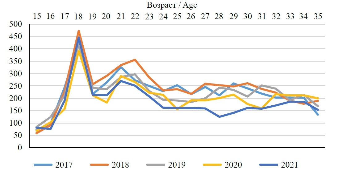 На статистических данных мы видим, что 17–19-летние представители молодежи приехали на обучение в Республику Мордовия из других регионов. Есть несколько причин, способных объяснить данную ситуацию: