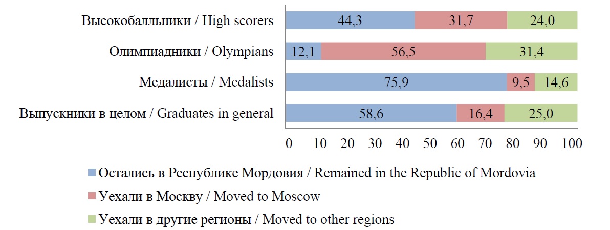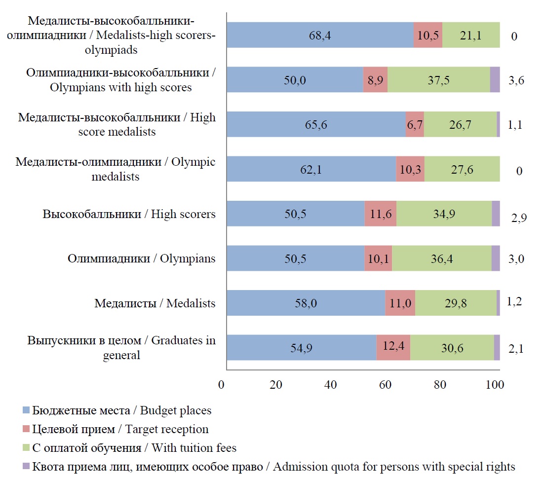 Если в отношении всей совокупности выпускников доля лиц, поступивших на обучение с оплатой, составляет немногим более 30 %, то меньший показатель мы наблюдаем только у медалистов и «пересекающихся» с медалистами категорий. И высокобалльники, и олимпиадники готовы поступать на платное обучение, если это связано с получением именно качественного образования по избранной специальности. Они более всего замотивированы на переезд.