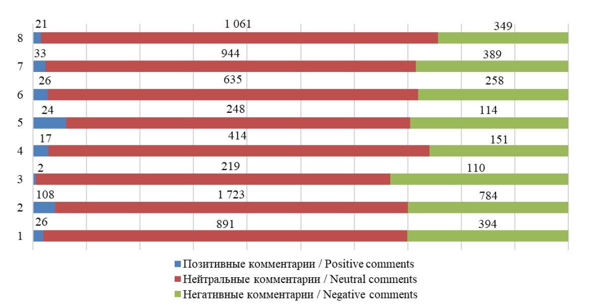 Fig. 1. Analysis of public comments and speeches on community pages in social networks about the transport reform (the number and nature of comments on Novokuznetsk (February 2021 – February 2022)