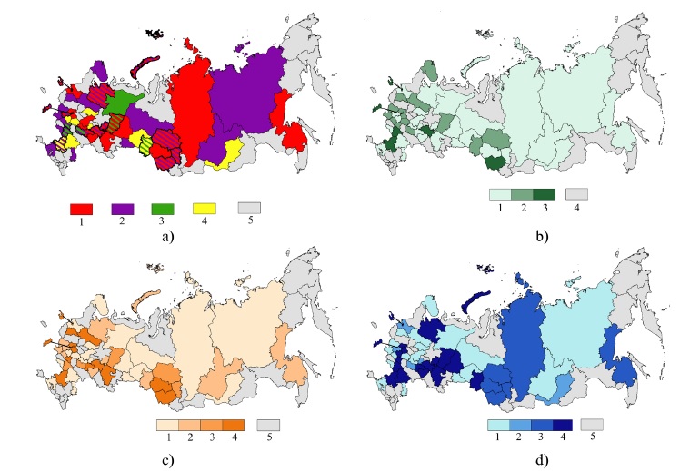 5 – кластеры отсутствуют; d) численность работников кластеров, чел.: 1 – менее 10 000; 2 – 10 000–20 000;