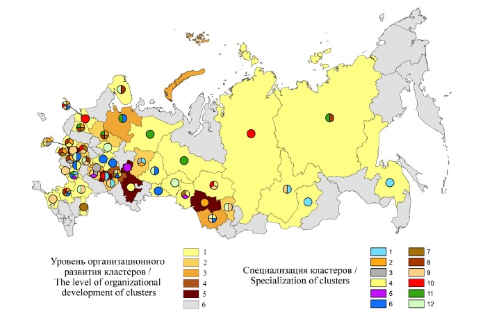 Fig. 2. The level of organizational development and specialization of clusters in the regions