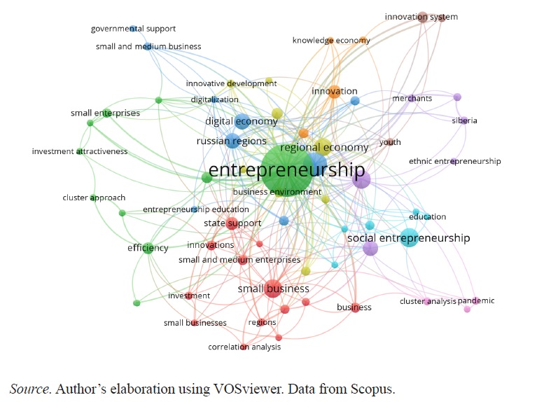 Figure 2 shows that the leading thematic clusters include the entrepreneurship, small business, social entrepreneurship, digital economy, innovation, state support, and efficiency, among others.