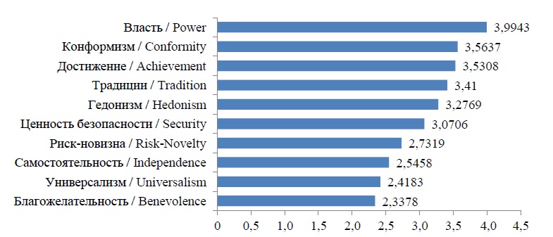 Причины вхождения в волонтерство исследователи рассматривают через взаимосвязанную структуру мотиваций и ценностей9. Для выявления ценностной структуры волонтеров-спасателей была использована методика ценностного портретника Ш. Шварца, где по 6-балльной шкале предлагалось оценить свою степень похожести на человека с определенными ценностями (1 означает «очень похож», 6 – «совсем не похож»). 21 переменная была преобразована в 10 базовых ценностей, затем были подсчитаны средние значения (чем меньше значение, тем более выражена ценность) (рис. 1).