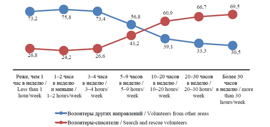 Вторая тенденция связана со значительными временными затратами на волонтерскую деятельность. Сравнительное исследование разных типов волонтеров, проведенное нами ранее, показало, что добровольные спасатели в среднем тратят больше времени в неделю на волонтерскую деятельность, чем добровольцы других направлений [1, с. 21]. Среди волонтеров, тратящих менее одного часа в неделю, 26,8 % спасателей и 73,2 % волонтеров других направлений, а среди тех, кто тратит 30 и более часов в неделю, соотношение обратное – 69,5 % спасателей против 30,5 % волонтеров прочих направлений. Эта тенденция может быть связана с особенностями работы добровольных спасателей, для которой характерны длительные поисково-спасательные работы или суточные добровольные дежурства в больницах, пожарных частях и т. д. (рис. 2).