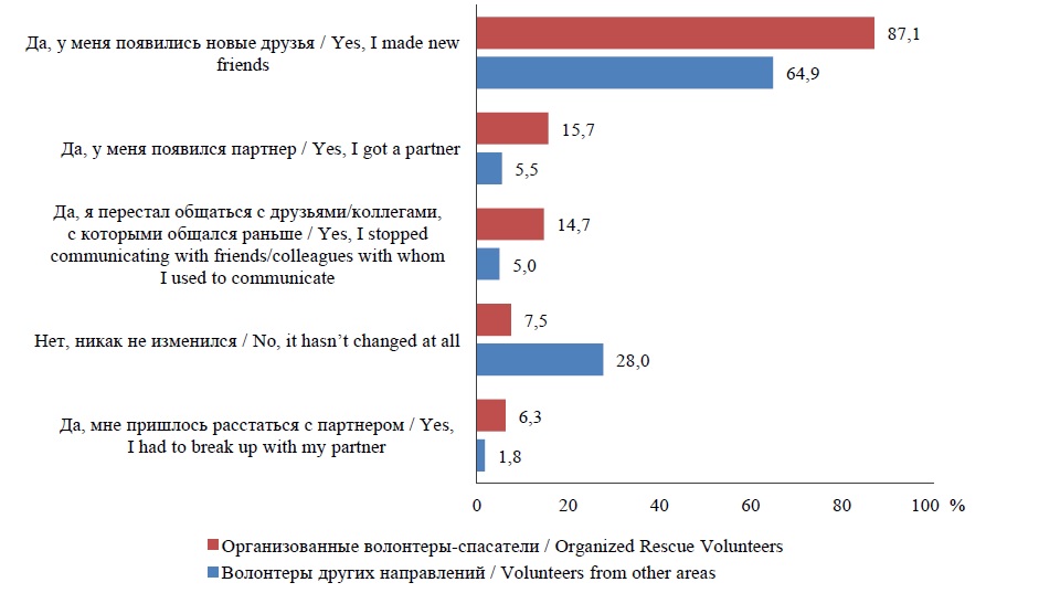 Организационная вовлеченность подтверждается также переменами в структуре социальных связей, которые выражаются в изменении круга общения с момента вступления в волонтерство. Для волонтеров в сфере спасательной работы изменения круга общения по сравнению с волонтерством в других направлениях более заметны (рис. 3).