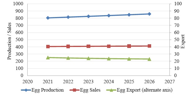 Thus, an increase in the egg production by 1 million, egg exports will increase by 0.7 million. In addition, an increase in the Profitability of egg production on 1% affects the increase in egg export volume by 0.06 million.