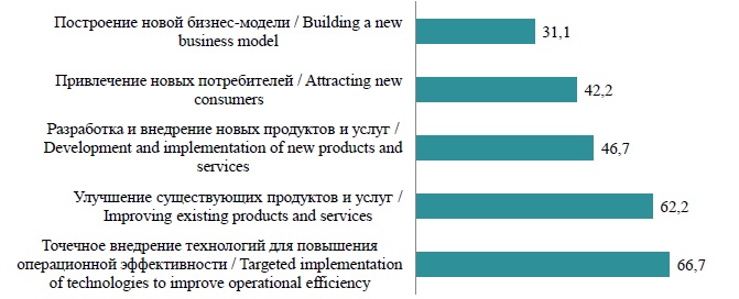 Цифровизация на обследованных предприятиях преимущественно направлена на точечное внедрение технологий для повышения операционной эффективности и улучшение существующих продуктов и услуг. Эти ответы выбрали более 60 % респондентов; построение новой бизнес-модели в качестве цели выбрали только 31 % опрошенных (рис. 2).