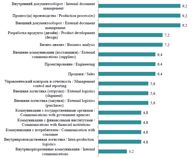 Основные области применения внедренных в компаниях-респондентах цифровых технологий (табл. 2) – это внутренний документооборот, коммуникации с банками и другими финансовыми структурами, управленческий контроль и отчетность (в этих функциональных областях доля от общего объема работы, выполняемая с использованием цифровых технологий, превышает 75 %), а также внешний документооборот, внешняя логистика, продажи, производство, проектирование, внутренние и внешние коммуникации, обеспечение безопасности (доля работ с применением цифровых технологий достигает и превышает 50 %).