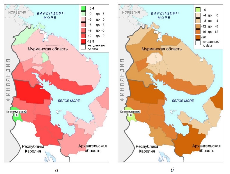 Рис. 2. Пространственная локализация г. о. Костомукша в контексте показателей воспроизводства населения арктических территорий: а – среднее значение коэффициента естественного прироста населения