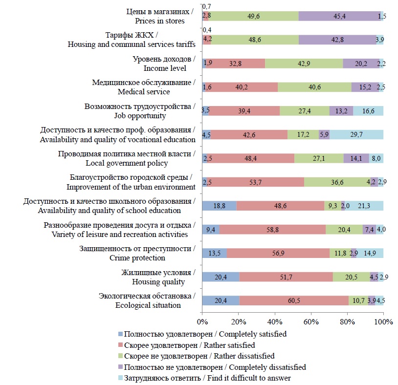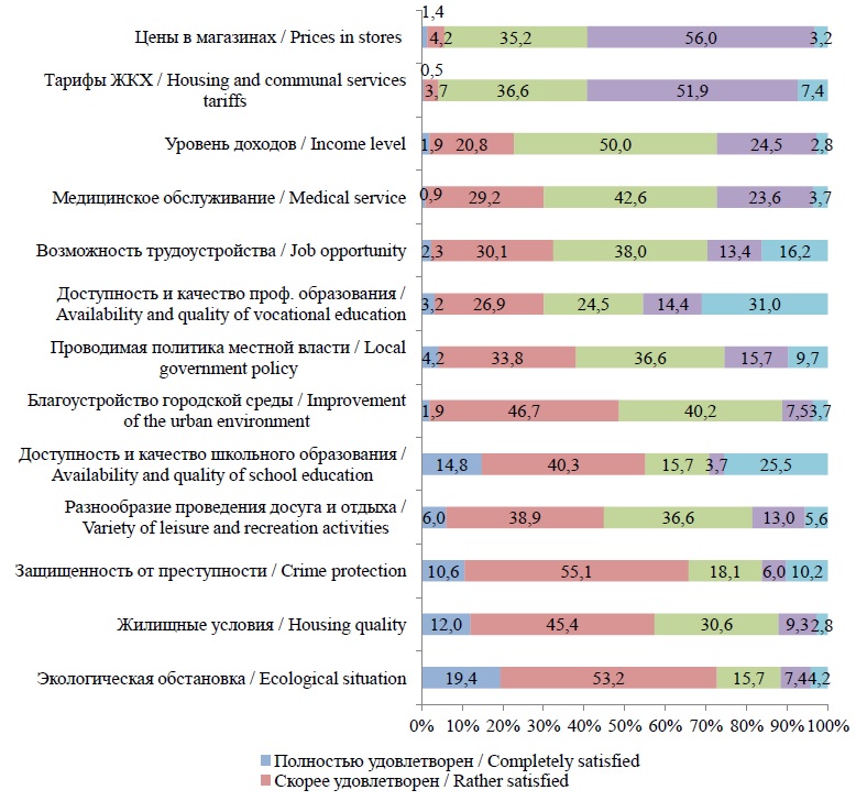 Средовые особенности территории в оценках населения. Важнейшими показателями, отражающими социально-экономическую устойчивость и конкурентоспособность города в привлечении человеческого капитала, являются удовлетворенность населения различными аспектами жизни в городе, воспринимаемые связь с местом проживания и возможность реализовать свои жизненные планы, а также характер миграционных установок населения. Удовлетворенность населения условиями проживания6 отражают оценки следующих аспектов, измеряемых с помощью 5-значной шкалы Ликерта: уровень доходов, жилищные условия, доступность и качество образования, возможность трудоустройства и др. Так, аспектами жизнедеятельности, имеющими наиболее выраженные положительные оценки (полностью удовлетворен и скорее удовлетворен) со стороны населения г. о. Костомукша стали: экологическая обстановка (80,9 % положительных оценок при 20,4 % со значением «полностью удовлетворен»), жилищные условия (72,1 и 20,4 % соответственно), защищенность от преступности (70,4 и 13,5 %), разнообразие и проведение досуга (68,2 и 9,4 %). Наибольшие значения отрицательных оценок удовлетворенности (оценки «скорее не удовлетворен» и «полностью не удовлетворен») населением г. о. Костомукша отмечены по следующим пунктам: цены в магазинах (95,1 % отрицательных оценок при 45,4 % со значением «полностью не удовлетворен»), тарифы на ЖКХ (91,5 и 42,8 % соответственно), уровень доходов (63,2 и 20,2 %), медицинское обслуживание (55,8 и 15,2 %) (рис. 3).
